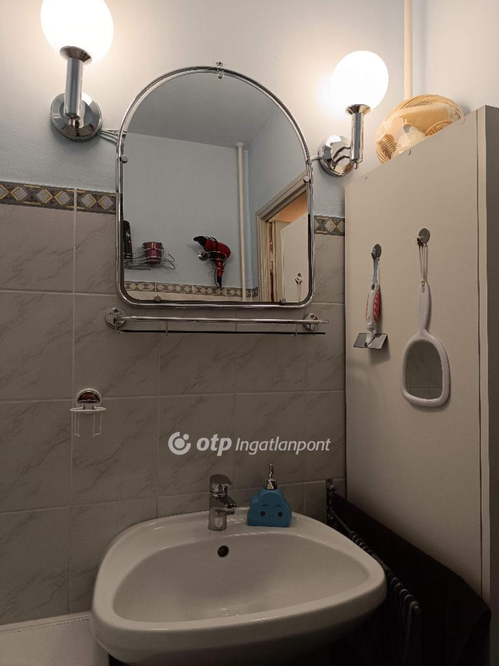 Balra található egy praktikus gardrób, benne beépített szekrényekkel, mellette különálló felújított fürdőszoba káddal, valamint külön WC.
