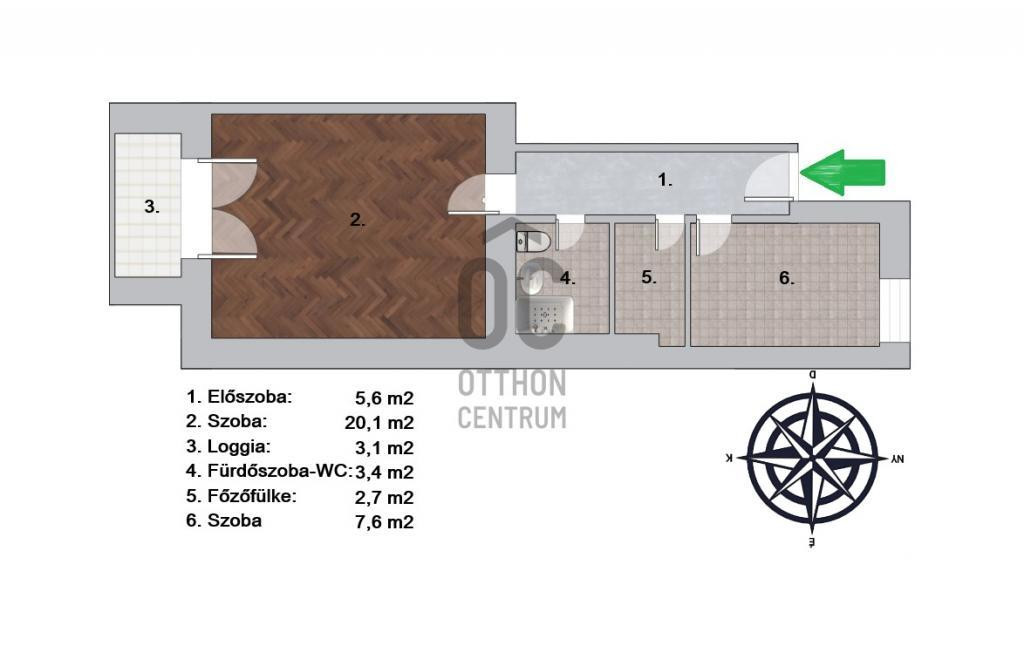 - Jelenlegi felosztása: előszoba, nappali, hálószoba, főzőfülke, fürdőszoba-WC, erkély.