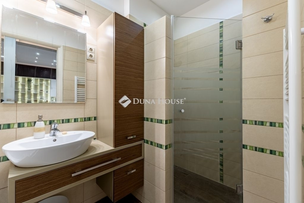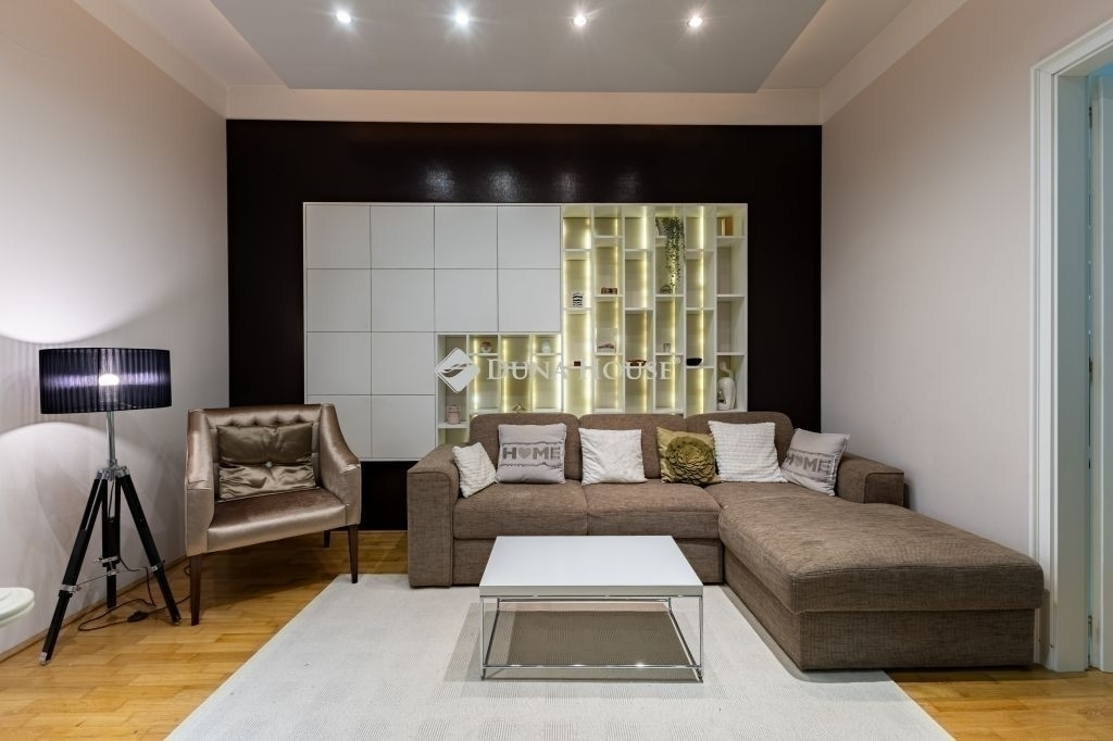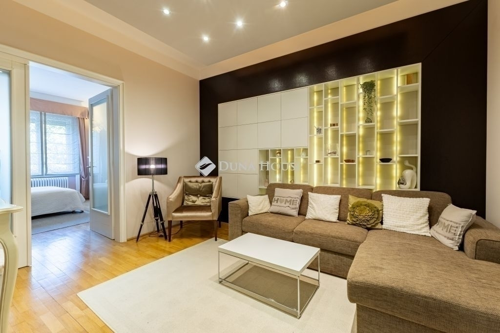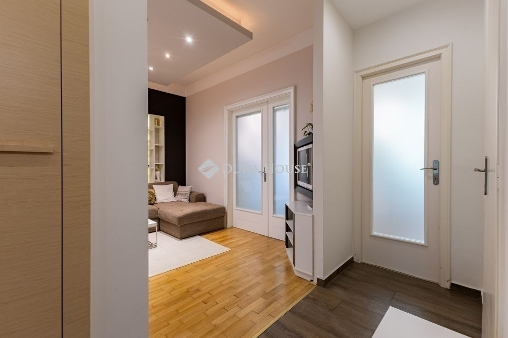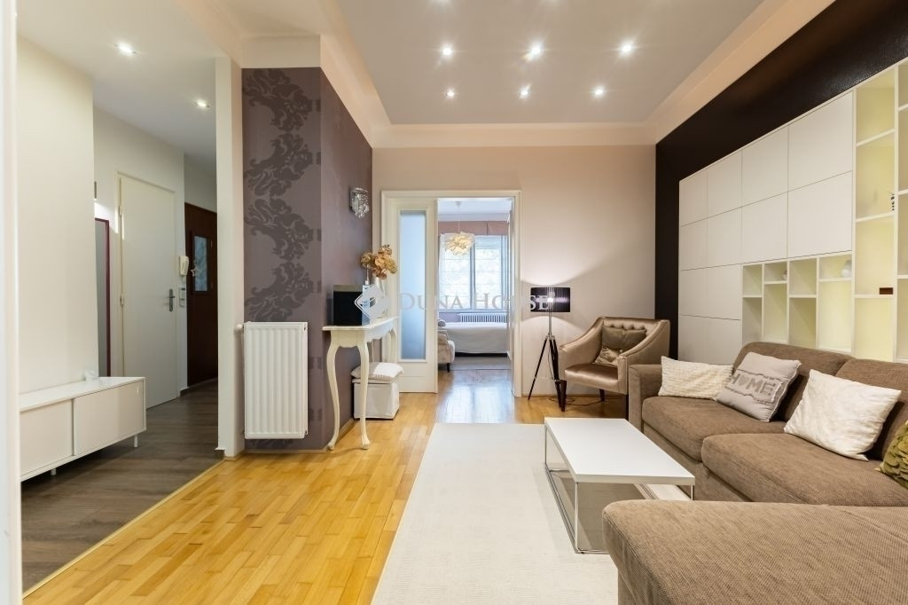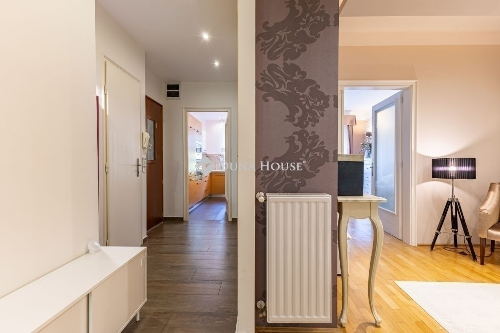 A szobák aljzatában a régi, halszálkában rakott, valódi parkettet felszedték és modern divatos módon, kötésben tették vissza. Az egyéb helyiségek kerámia lappal burkoltak. Számos gipszkarton dobozolással, modern tereket alakítottak ki a különböző hangulatvilágítások elhelyezésére. Átalakításra került a fürdőszoba, ahol egy sarokkád és egy zuhanyzó kapott helyet. A lichthofra szellőztetethető WC, külön-bejárattal érhető el. A lakás nyílászárói az építéskorabeli fa szerkezetek, szépen felújítva, elektromos redőnnyel szerelve, a konyha ablaka hőszigetelő üvegezésű műanyag szerkezet. A konyhában modern konyhabútor került beépítésre, AEG márkájú gépészettel, amely a vételár részét képezi, csakúgy, mint a lakásban található összes egyéb bútor.