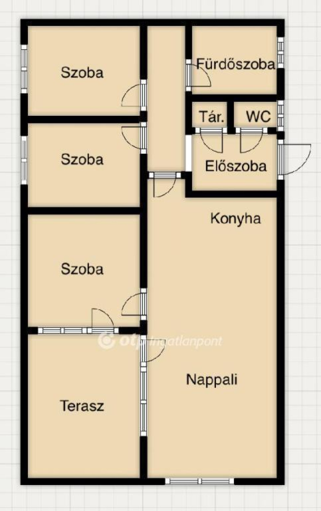 Az elosztás rendkívül praktikus: amerikai konyhás étkező-nappali, három külön bejáratú hálószoba, káddal és zuhanyzóval is felszerelt fürdőszoba, külön mellékhelyiség, kamra és mosóhelyiség szolgálja a mindennapi kényelmet.