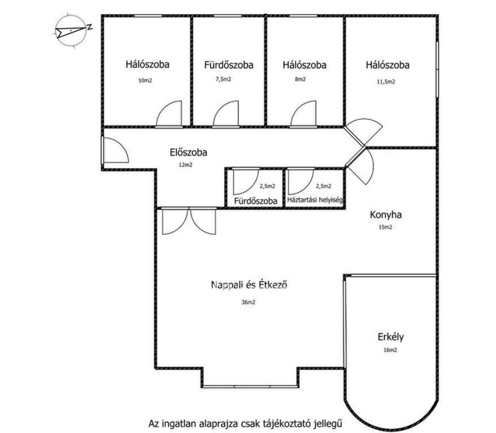 Elrendezés: Az ingatlanban három különnyíló hálószoba, két elegáns fürdőszoba (kádas és zuhanyzós kialakítással), egy háztartási helyiség és egy reprezentatív előtér található.