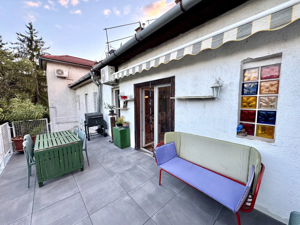 Az ingatlan alapvetően jó állapotú, villany- vízvezetékeket, műanyag nyílászárókat (nem mind) kicserélték, fürdőszoba teljes felújításon esett át, kádat és zuhanyzót is kapott. Wc külön található, mindkettő ablakos. Kombi cirkó kazán egész belsejét 2 éve kicserélték, egy külön kis helyiségben található a fürdő mellett, ahol a mosógép is. A szobák igazi faparkettásak, a többi helyiség járólappal burkolt. Az amerikai konyhás nappali 63 m2, ezért ezen a szinten könnyedén leválasztható egy kényelmes méretű hálószoba igény szerint. Innen jutunk ki egy tágas 21 m2-es teraszra, mely rendkívül napfényes, hangulatos. Az emeleten található egy bruttó 12 és 11,3 m2-es hálószoba, valamint egy kis gardrób helyiség, ahol van víz kiállás. Ennek a szintnek a nettó (190 feletti) alapterülete 15 m2, a bruttó (190 alatti rész felével együtt) 29,4 m2. A maximális belmagasság itt 2 méter, az alsó szinten 280 cm. Klimatizált a felső emelet, tavaly lett kicserélve a klíma berendezés.
