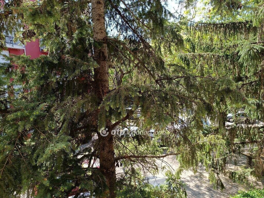 A 4 m2-es erkélyről kellemes, zöld kertre nyíló kilátás nyílik, ahol az ezüstfenyők és fák nyugalmat árasztanak.