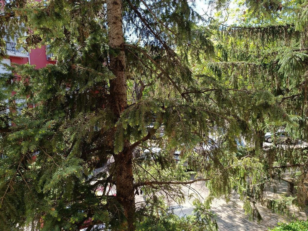 A 4 m2-es erkélyről kellemes, zöld kertre nyíló kilátás nyílik, ahol az ezüstfenyők és fák nyugalmat árasztanak.