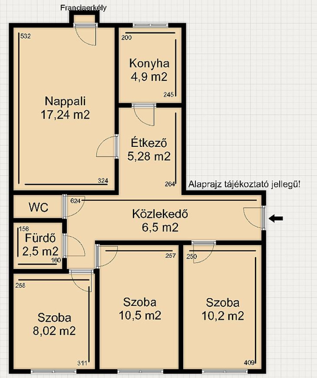 A Törökugrató utcában eladásra kínálunk egy 66 m²-es, első emeleti panel lakást, amely közepes állapotú, ugyanakkor jól karbantartott, élhető terekkel rendelkezik. Az ingatlan 3 szoba + nappali elosztású, így ideális választás lehet családoknak, pároknak vagy akár befektetési célra is (bútorozott így azonnal kiadható is lehet).