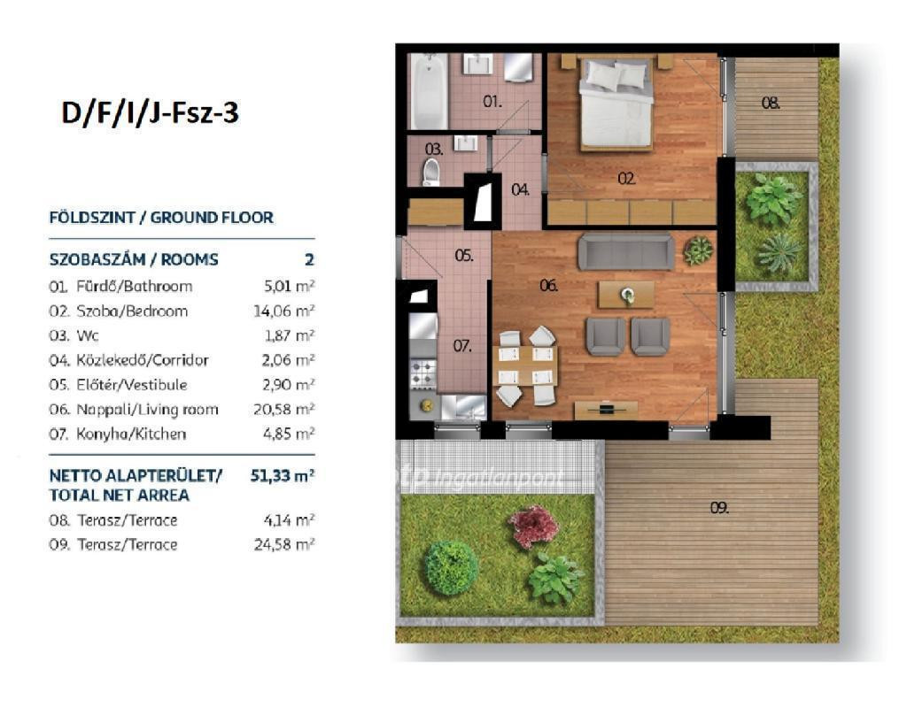 Lakások mérete: 43 nm-es, 1,5 szobás lakástól a 150 nm-es, 5 szobás és a tetőteraszos, exkluzív penthouseig.