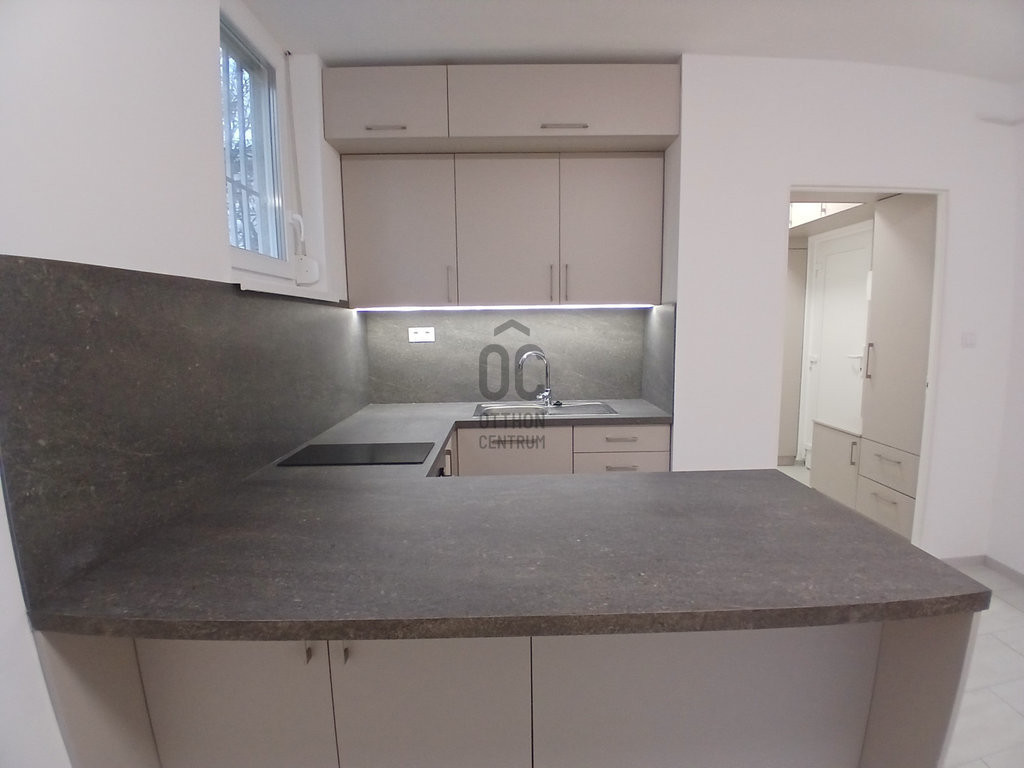 Eladó Budapest 11. kerületében, Sasad városrészben, a Rahó utcában egy frissen felújított földszinti, zöld kertre néző garzonlakás.