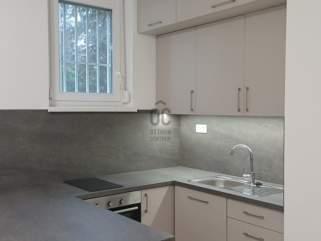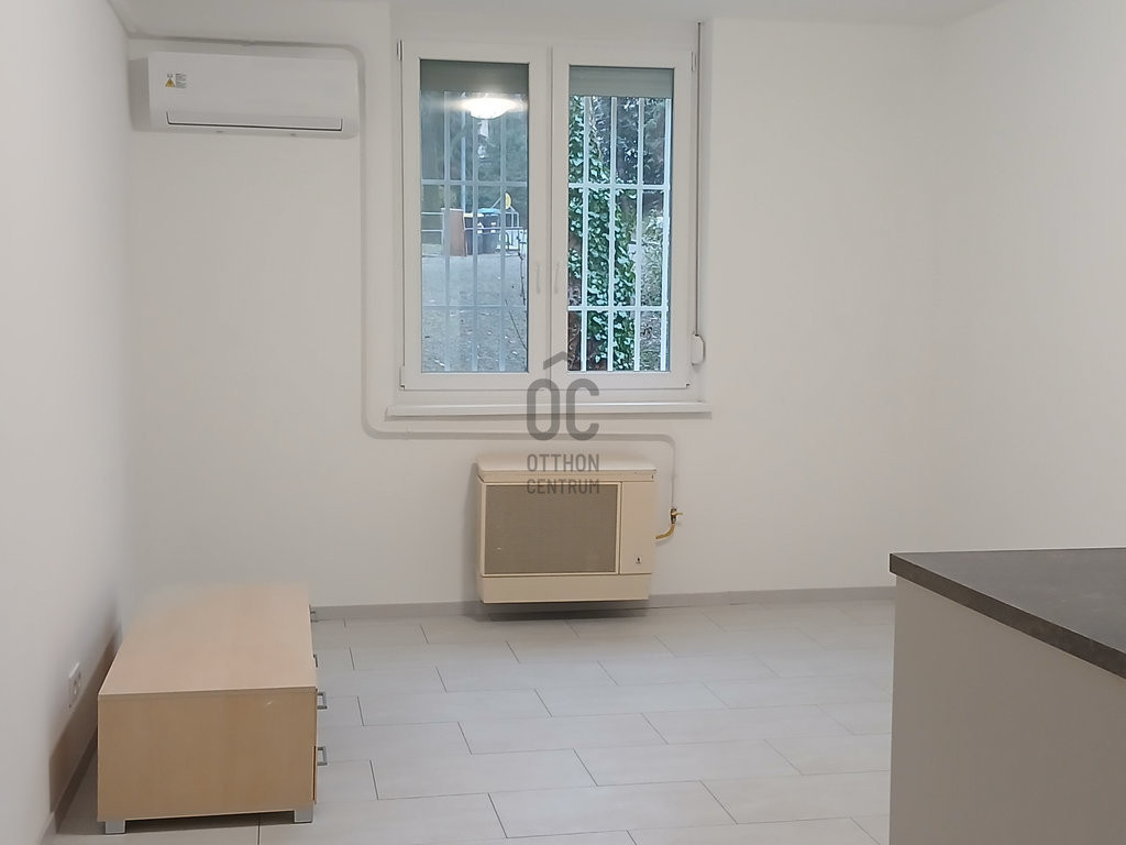 Eladó Budapest 11. kerületében, Sasad városrészben, a Rahó utcában egy frissen felújított földszinti, zöld kertre néző garzonlakás.