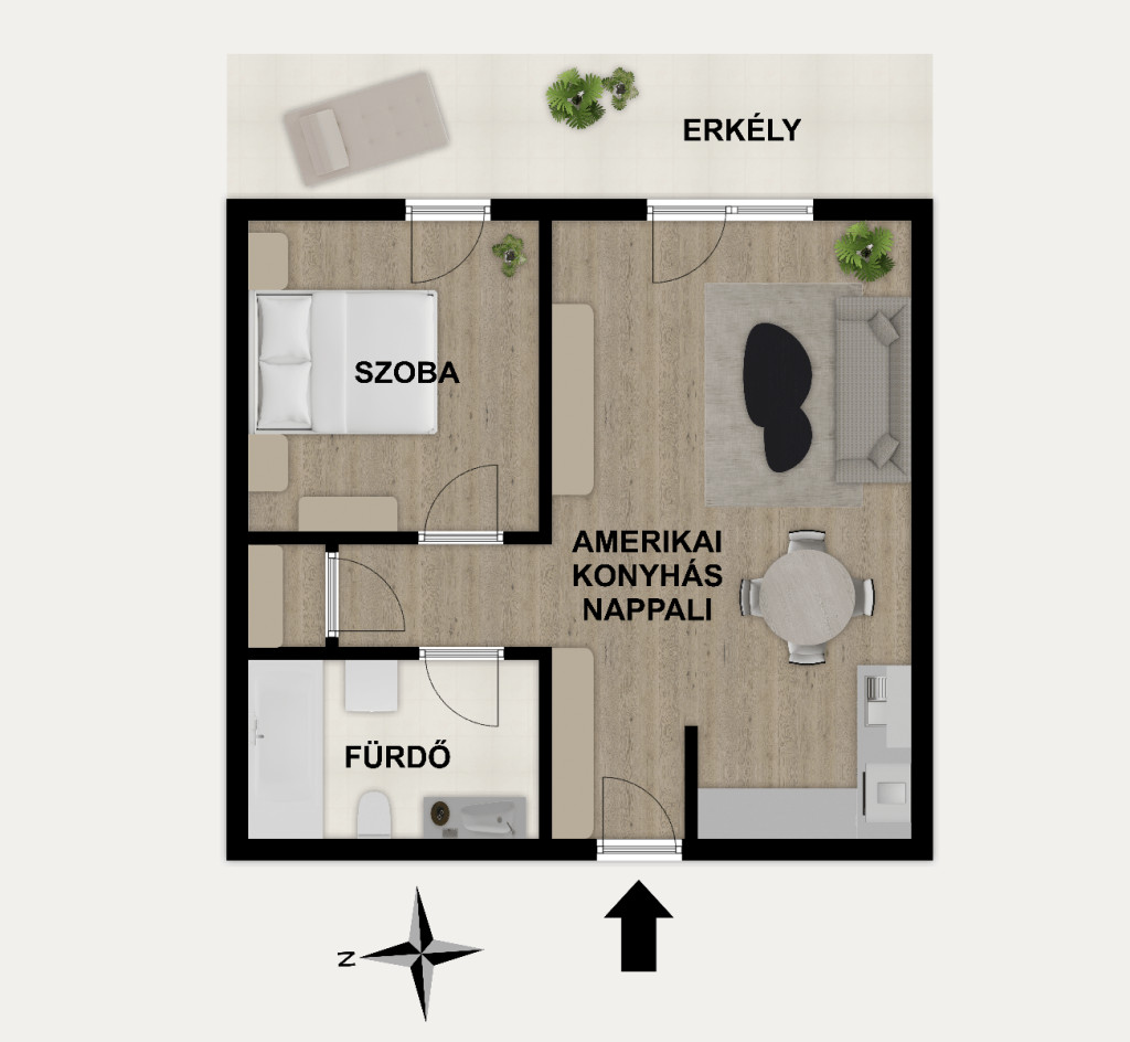 Az 45 m2-es ingatlanban amerikai konyhás nappali, hálószoba, fürdőszoba, tároló és egy 10 m2-es erkély található. A lakásban 3 rétegű nyílászárók, hőszivattyús hűtés-fűtés, prémium burkolatok és bútorok kerültek beépítésre.