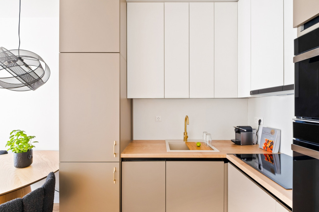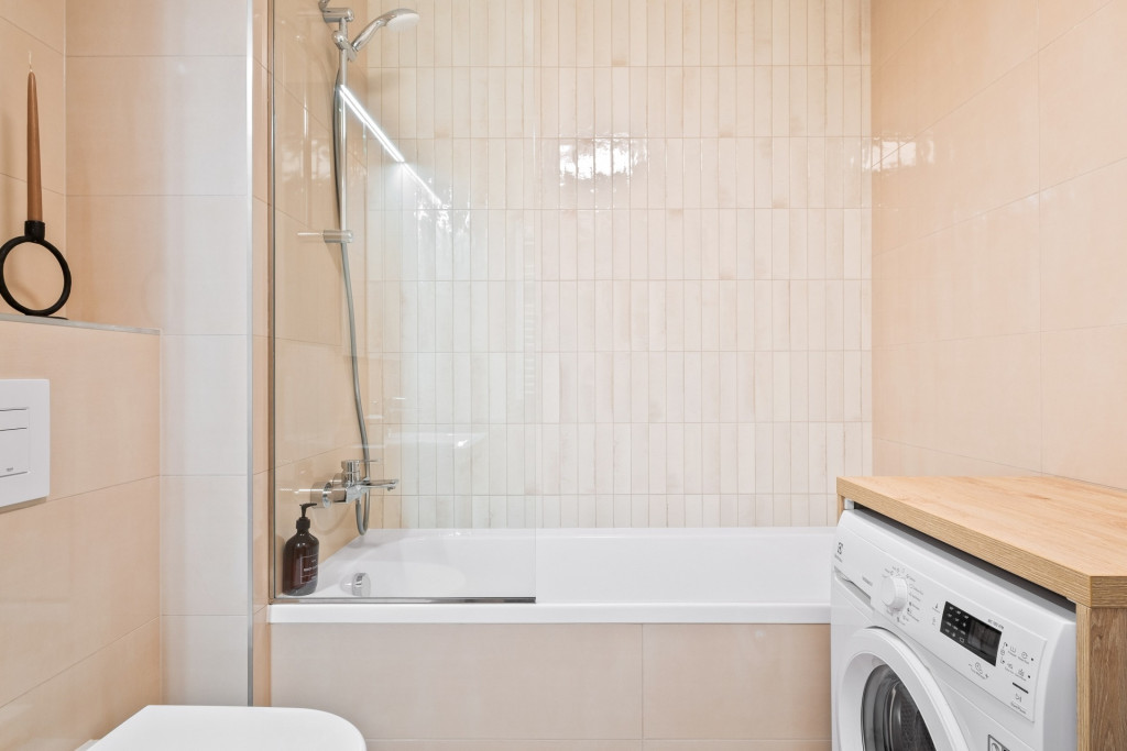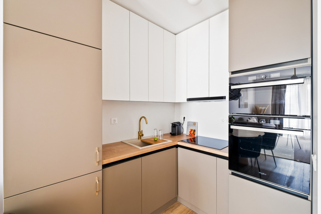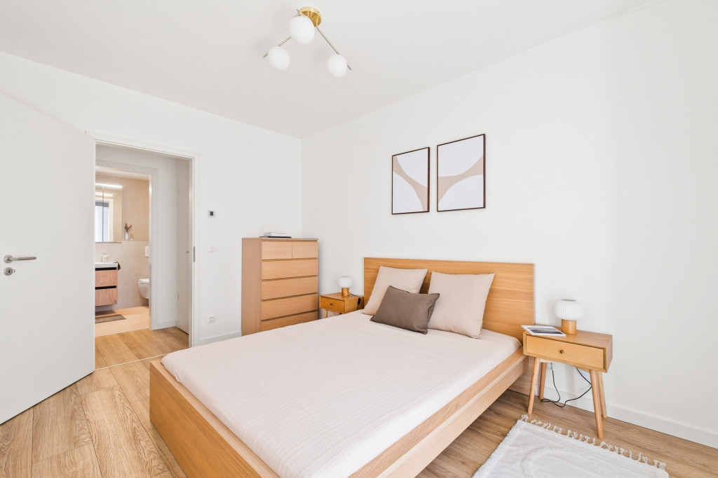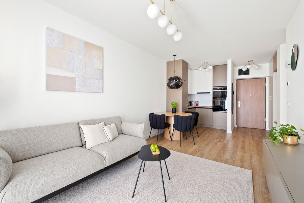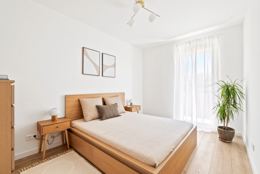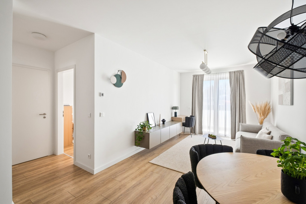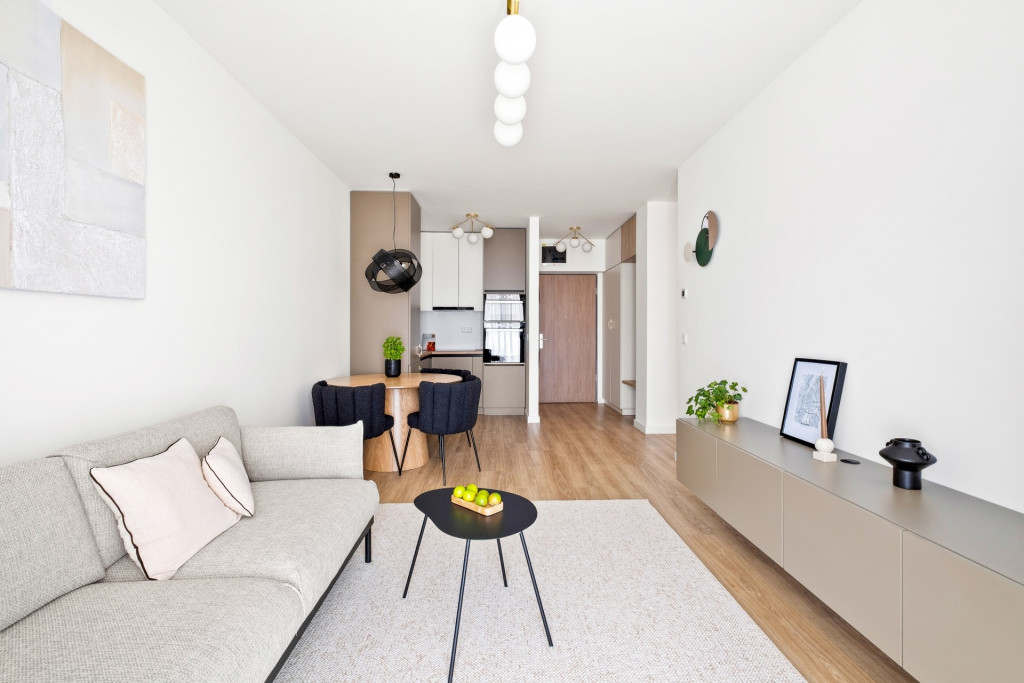 The 45 m2 property has a living room with kitchen, a bedroom, a bathroom, a storage and a 10 m2 balcony. The apartment has 3-layer windows, heat pump cooling and heating, premium materials and furniture.