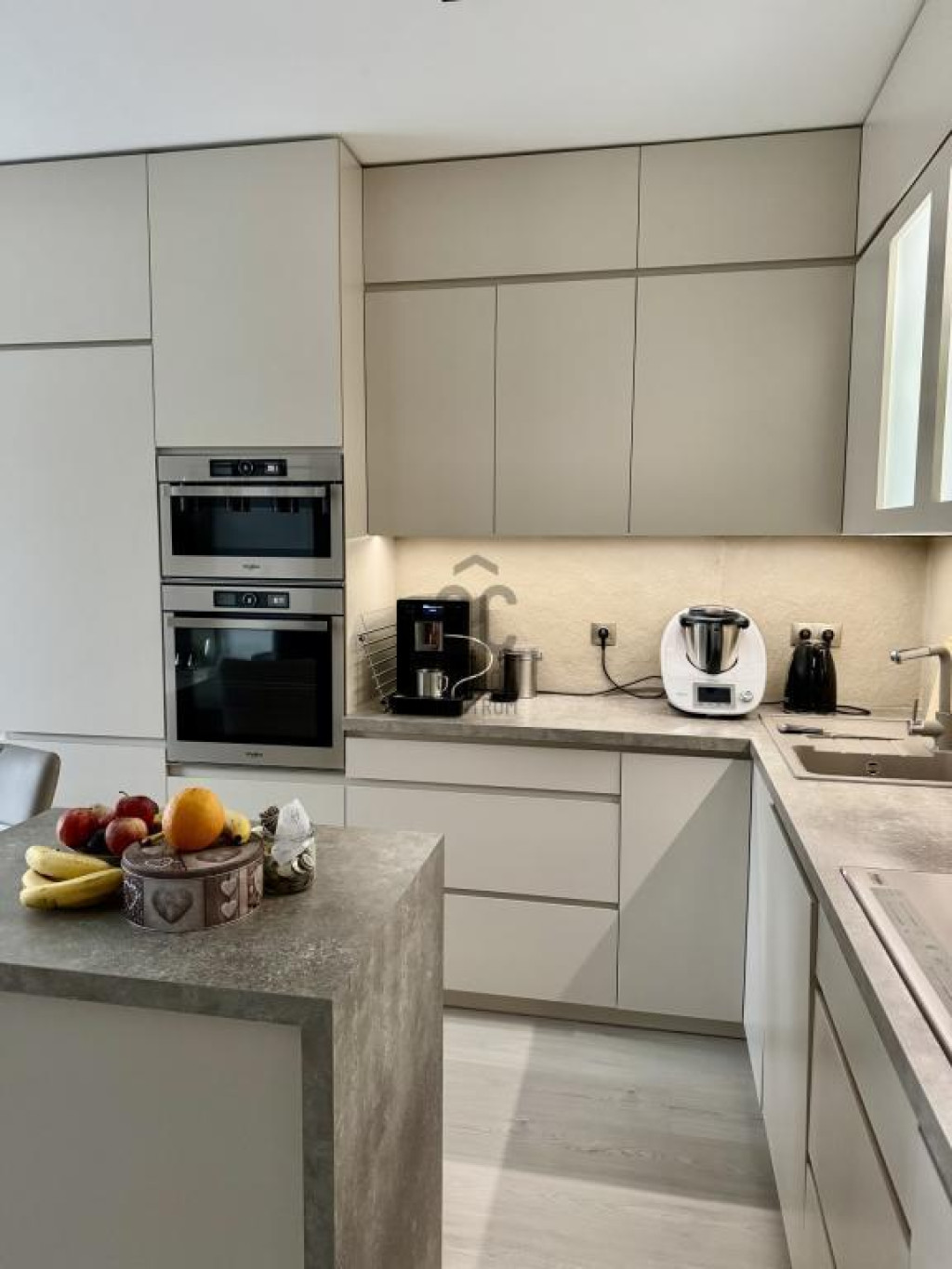 A lakás központja egy tágas, stílusos élettér. A konyha teljesen gépesített (beépített hűtő-fagyasztó, sütő, mikró, mosogatógép, főzőlap, elszívó), külön konyhaszigettel és bőséges tárolóhellyel. Az étkezőhöz egyedi, beépített asztal tartozik. A nappali és az előszoba részen beépített gardrób, TV-konzol és polcrendszer kapott helyet.