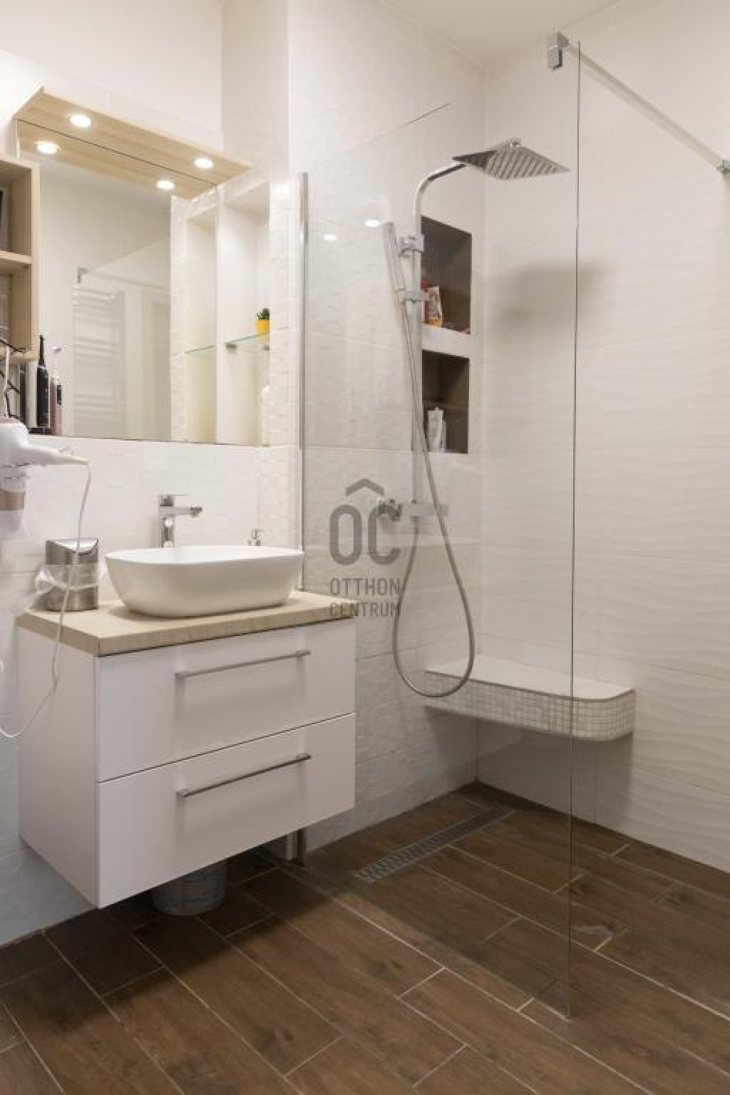 Letisztult kialakítású, épített zuhanyzóval és praktikus beépített polcokkal.