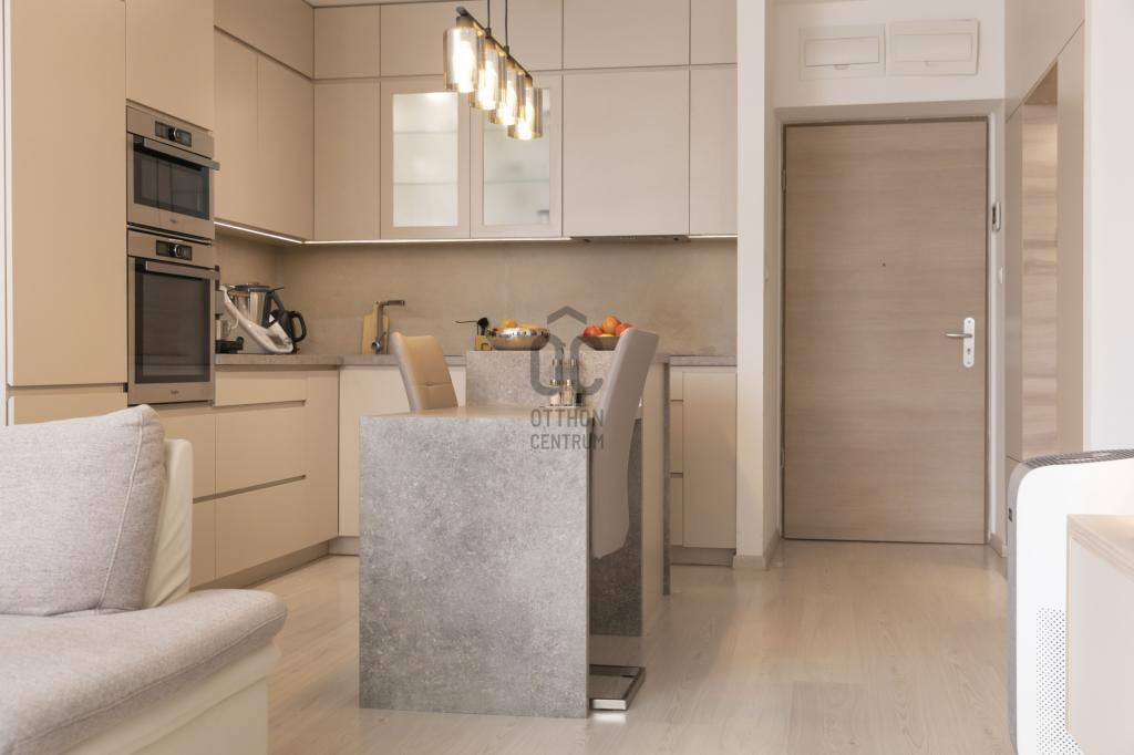 A lakás központja egy tágas, stílusos élettér. A konyha teljesen gépesített (beépített hűtő-fagyasztó, sütő, mikró, mosogatógép, főzőlap, elszívó), külön konyhaszigettel és bőséges tárolóhellyel. Az étkezőhöz egyedi, beépített asztal tartozik. A nappali és az előszoba részen beépített gardrób, TV-konzol és polcrendszer kapott helyet.