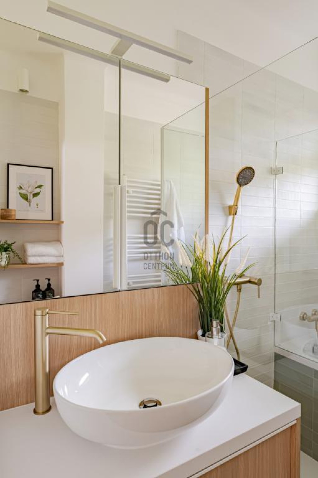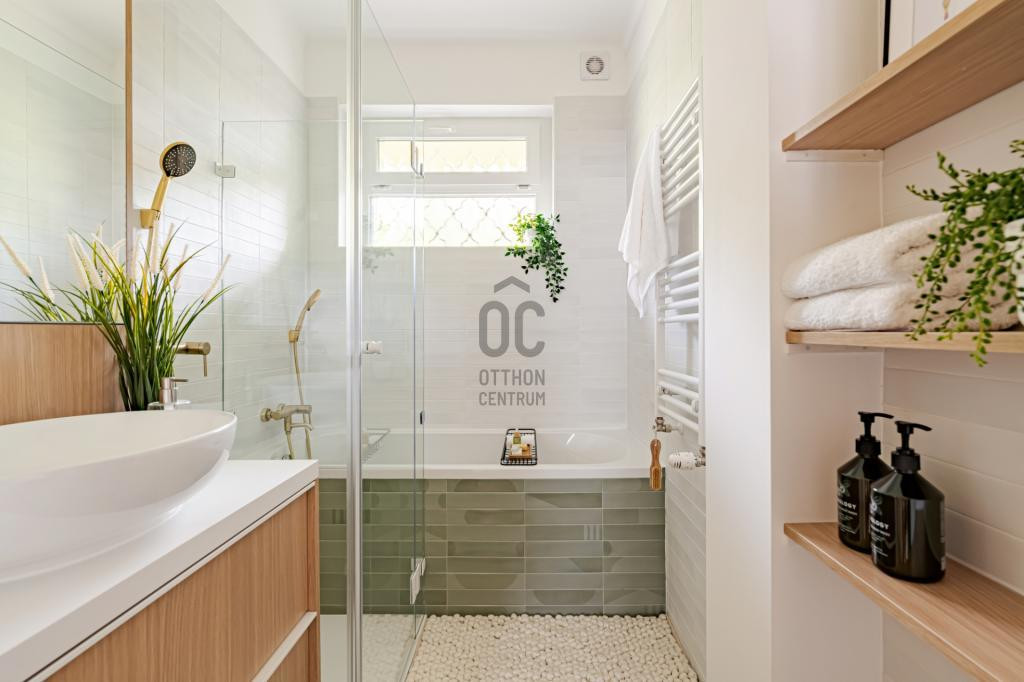 A fürdőszoba egyszerre modern és praktikus: káddal, zuhanyzóval és egyedi mosdószekrénnyel felszerelt.