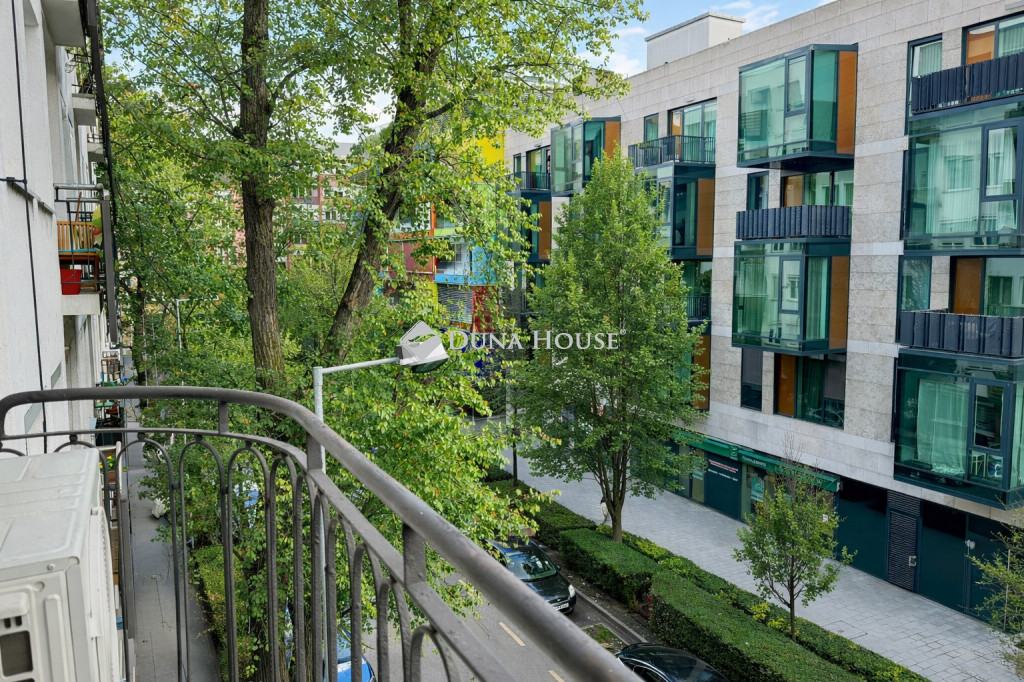A lakáshoz két erkély tartozik, amelyek közül az egyik az utcára, a másik a belső udvarra néz, így a lakók egyszerre élvezhetik a városi hangulatot és a csendes, zöld környezetet. A társasház gondozott kerttel és kerékpártárolóval is rendelkezik.