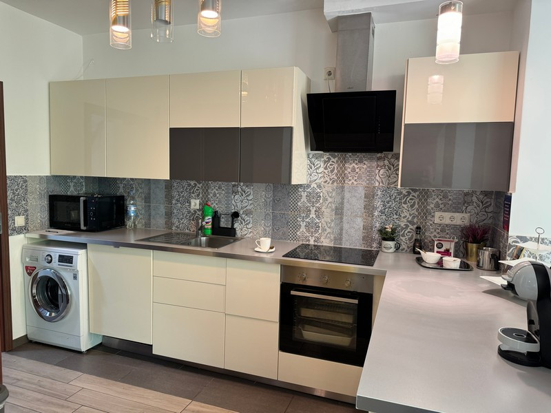 Konyha gépesített, elszívó, mosogatógép, elektromos tűzhely a vétel árát képezik.