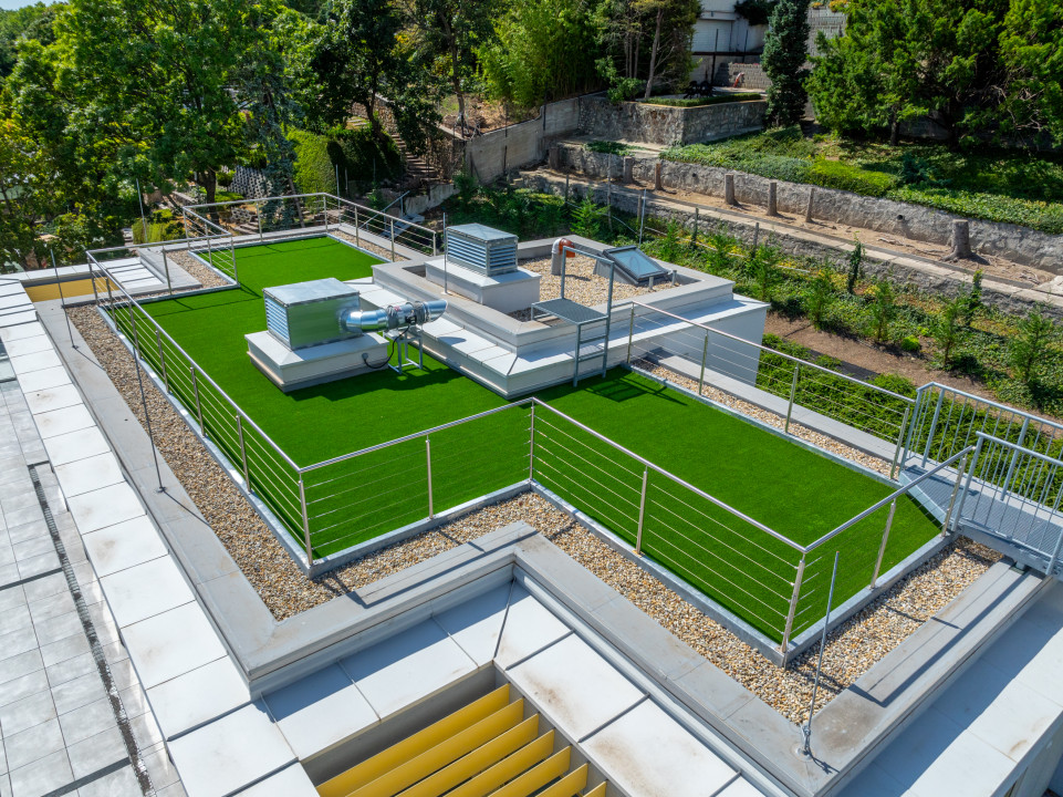 A tetőkert valódi ritkaság: teljes körpanorámát nyújt, ideális pihenésre vagy vendéglátásra.