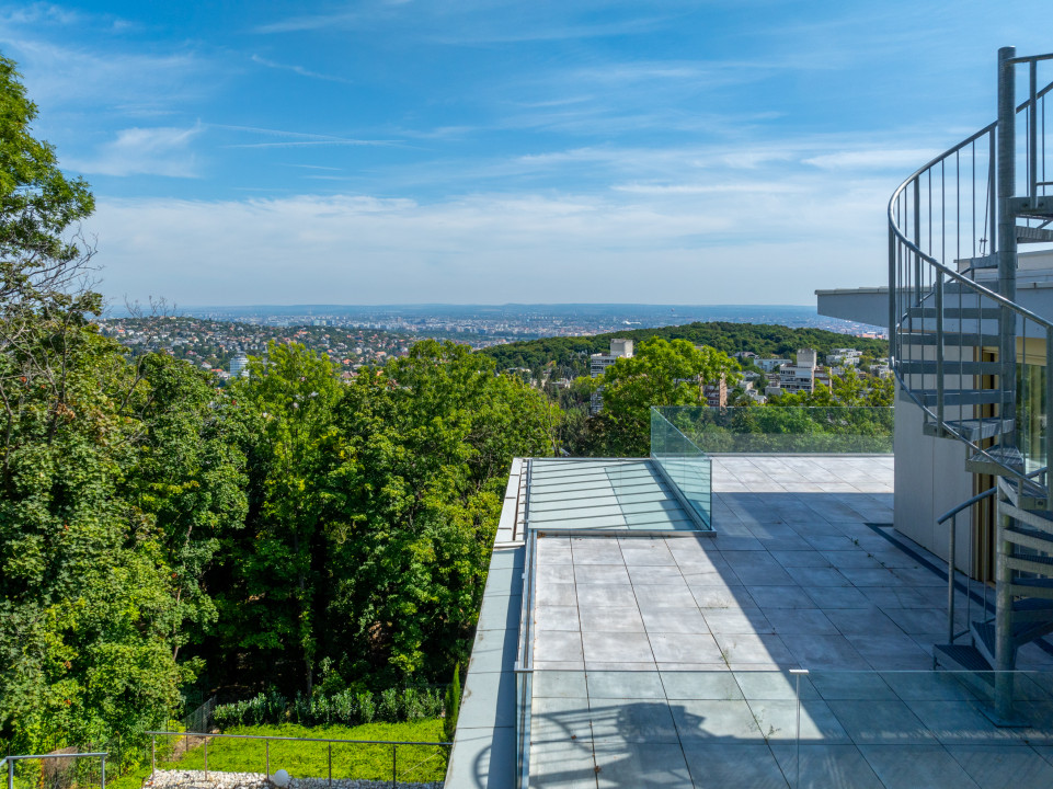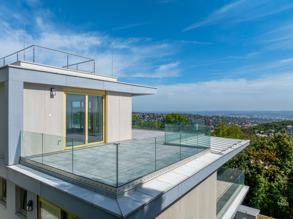 A legfelső emeleti penthouse lakás egyik legnagyobb értéke a három oldalról körpanorámás terasz és a 360 fokos kilátást biztosító tetőkert.
