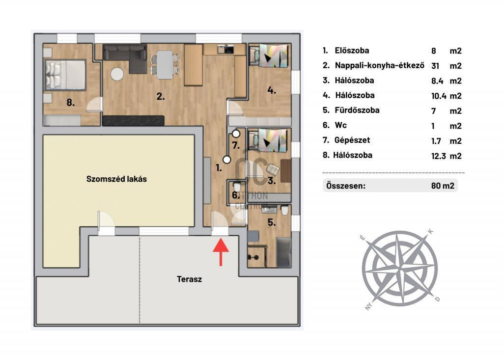 - Földszinti, 80 m2-es, 4 szobás, 27 m2-es terasszal rendelkező, esztétikailag frissen felújított ingatlan.