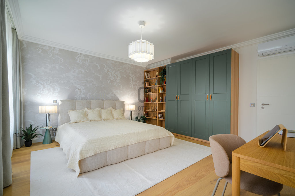 A privát lakrészek kifinomult arányai biztosítják az intimitást: szülői háló, további hálószobák vagy dolgozószoba, igényesen kialakított fürdők, valamint átgondolt tárolórendszer — beépített szekrényekkel, gardróbbal és külön háztartási helyiséggel.