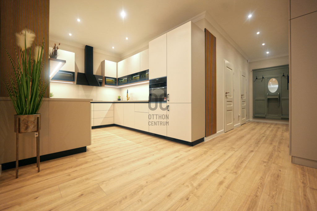 - A nappali, konyha és előtér közel 40 m²-es összefüggő teret alkotnak, amely rendkívül világos és tágas hatást biztosít.