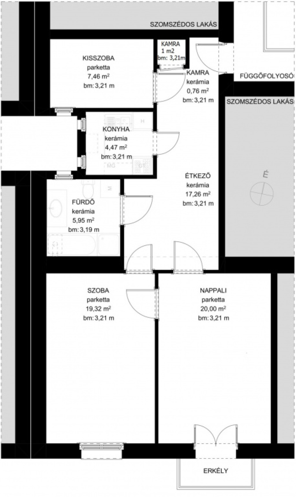 A lakásba belépve, egy kis előtéren keresztül jutunk a központi hallba. Itt alakították ki az étkezőt, és innen közelíthetők meg a további helyiségek, 3 külön nyíló szoba, konyha, éléskamra, kádas és zuhanyzós fürdőszoba WC-vel, valamint a nappaliból a Hertelendy utcára nyíló erkély nyújt kellemes pihenést az itt élők számára. A 75 nm-es lakótér 17 nm-es előtér-hall-étkezővel, 7,5 nm-es, 19,5 nm-es, 20 nm-es szobával, 4,5 nm-es ablakos konyhával, 0,75 nm-es kamrával, 6 nm-es ablakos fürdővel, valamint 3 nm-es erkéllyel rendelkezik.