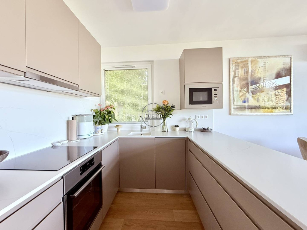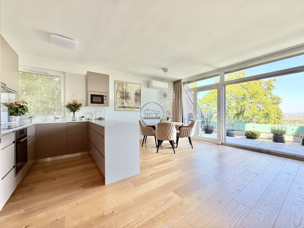 A lakás szíve a világos, amerikai konyhás nappali, amely közvetlen kapcsolatban áll a 16 nm-es panorámás terasszal – tökéletes helyszín egy nyugodt reggelihez vagy esti pihenéshez, miközben a város látképe tárul elénk.