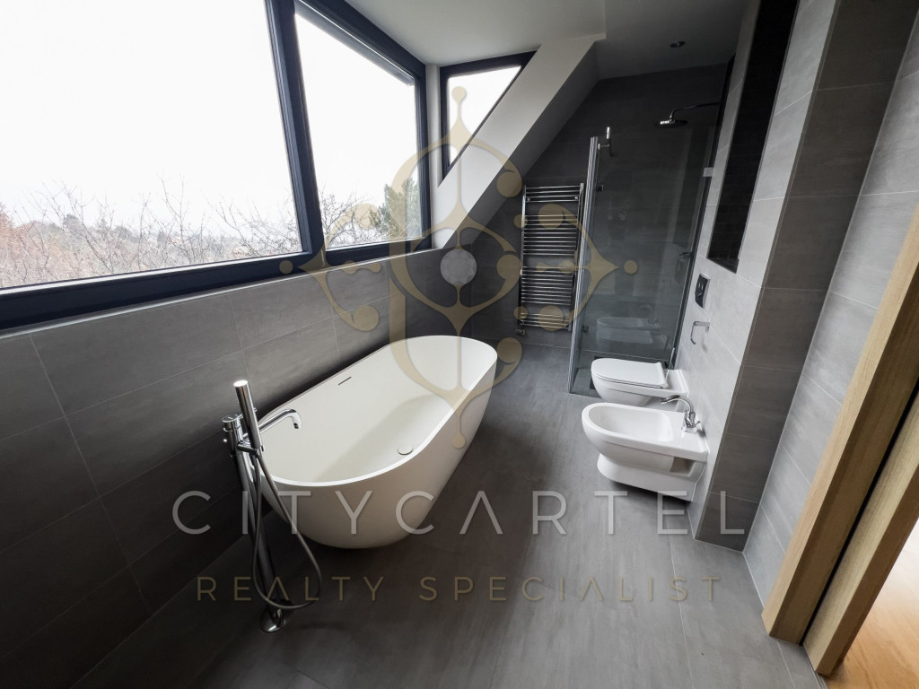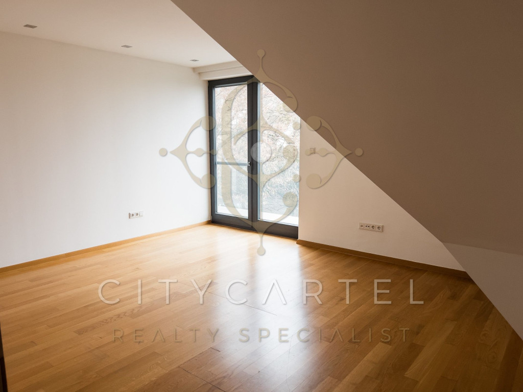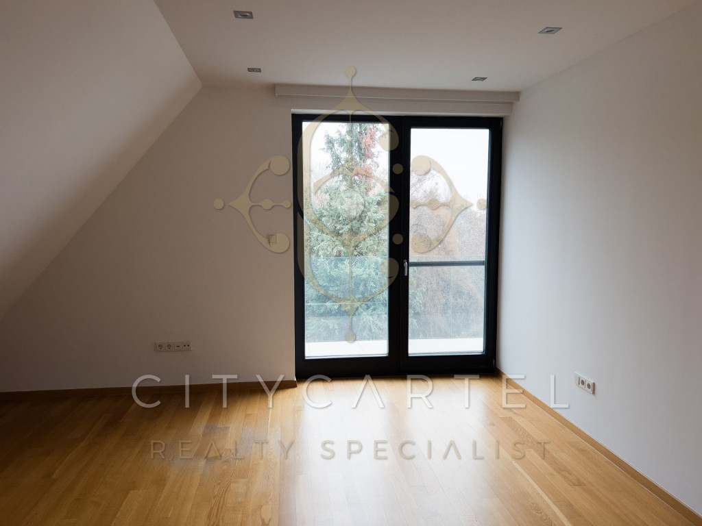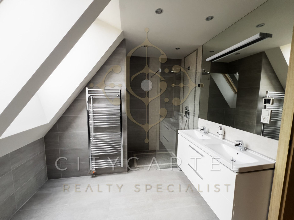 A felső szinti lakás 7 tágas szobából, 2 elegáns fürdőszobából, valamint 2 garázsból áll, a telken belül pedig további 6–8 autó számára kialakított kényelmes beállók állnak rendelkezésre.
