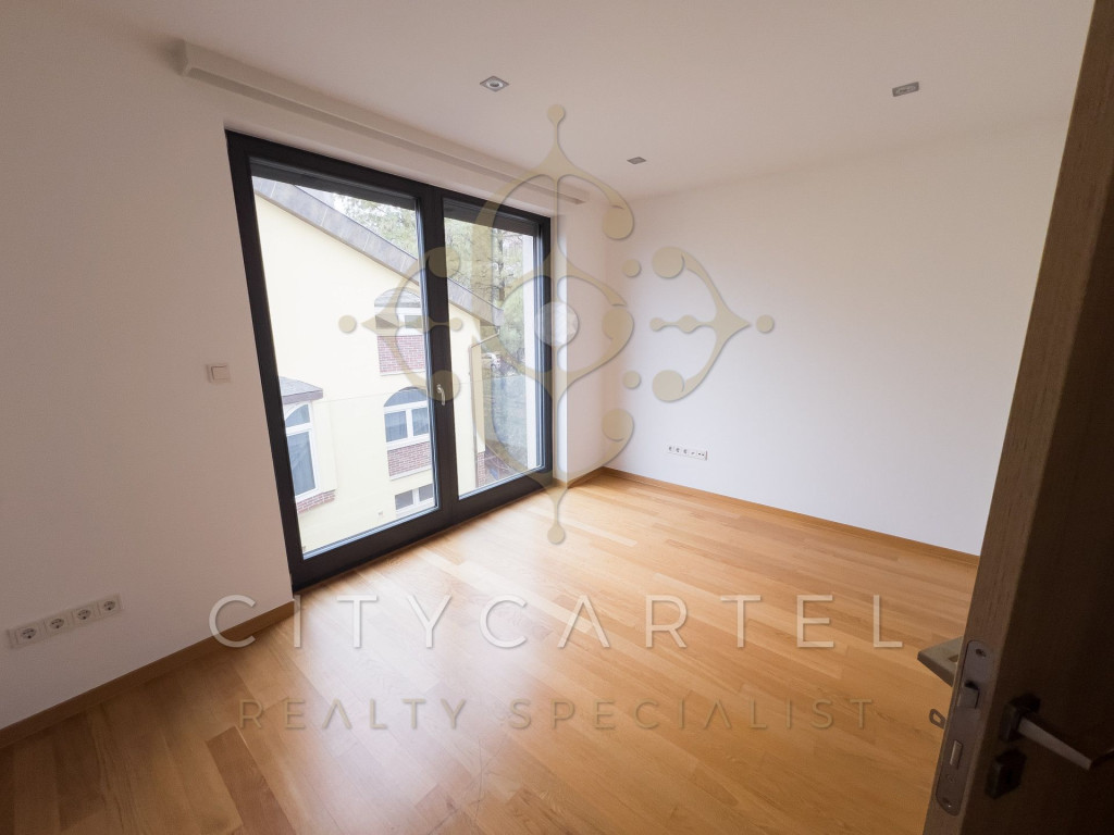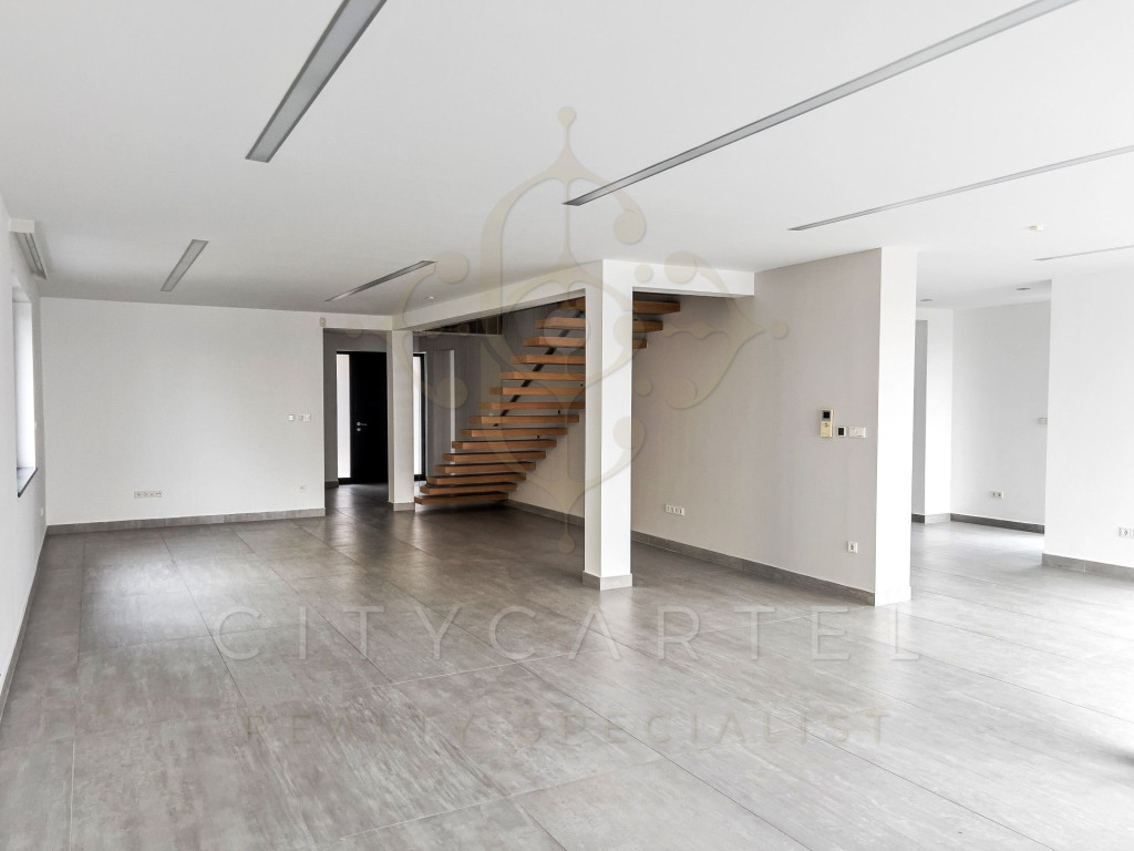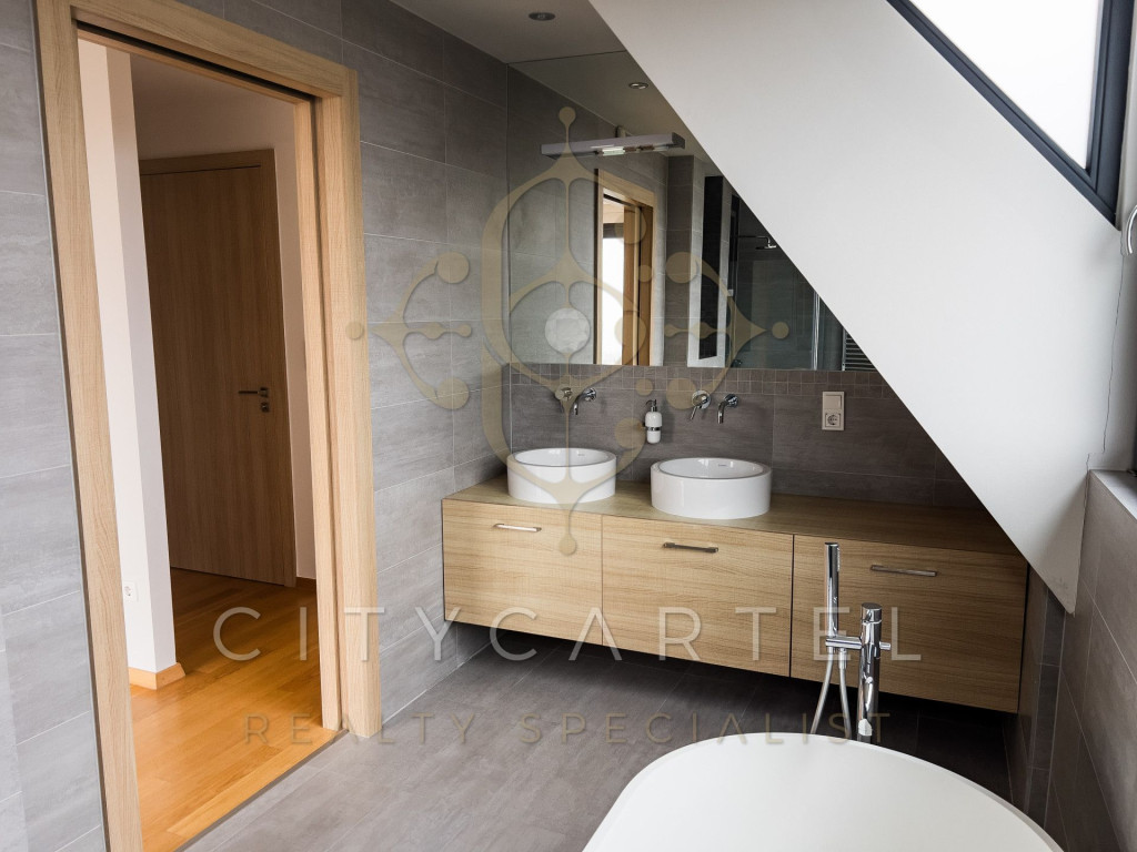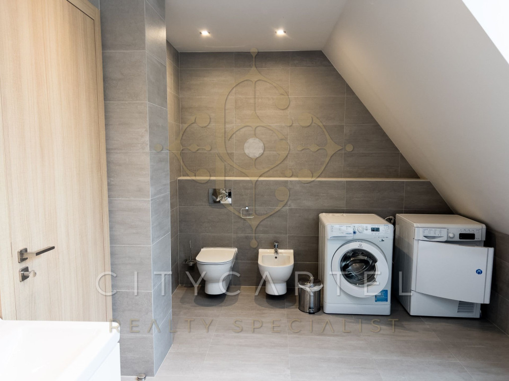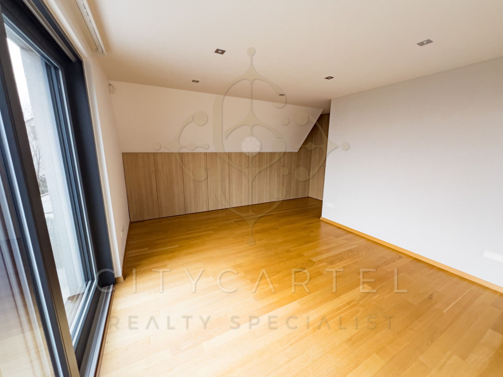 A felső szinti lakás 7 tágas szobából, 2 elegáns fürdőszobából, valamint 2 garázsból áll, a telken belül pedig további 6–8 autó számára kialakított kényelmes beállók állnak rendelkezésre.