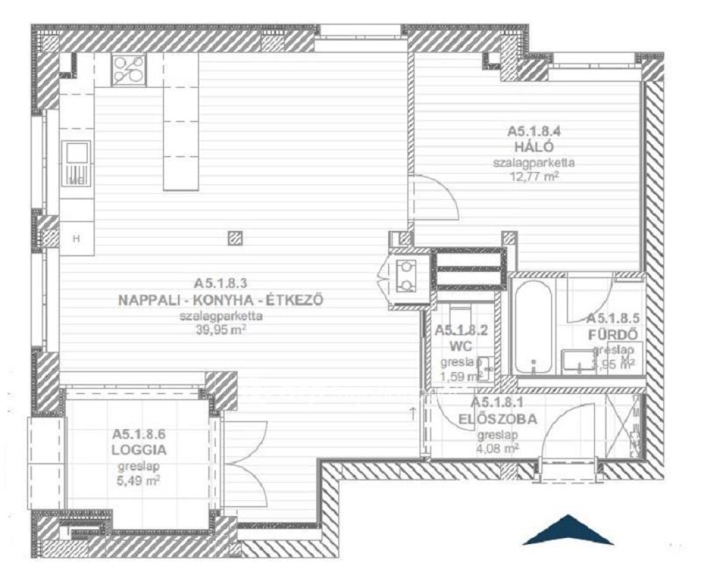 A lakás helyiségei: Előszoba, WC, Szoba, Amerikai konyhás nappali, Fürdőszoba.