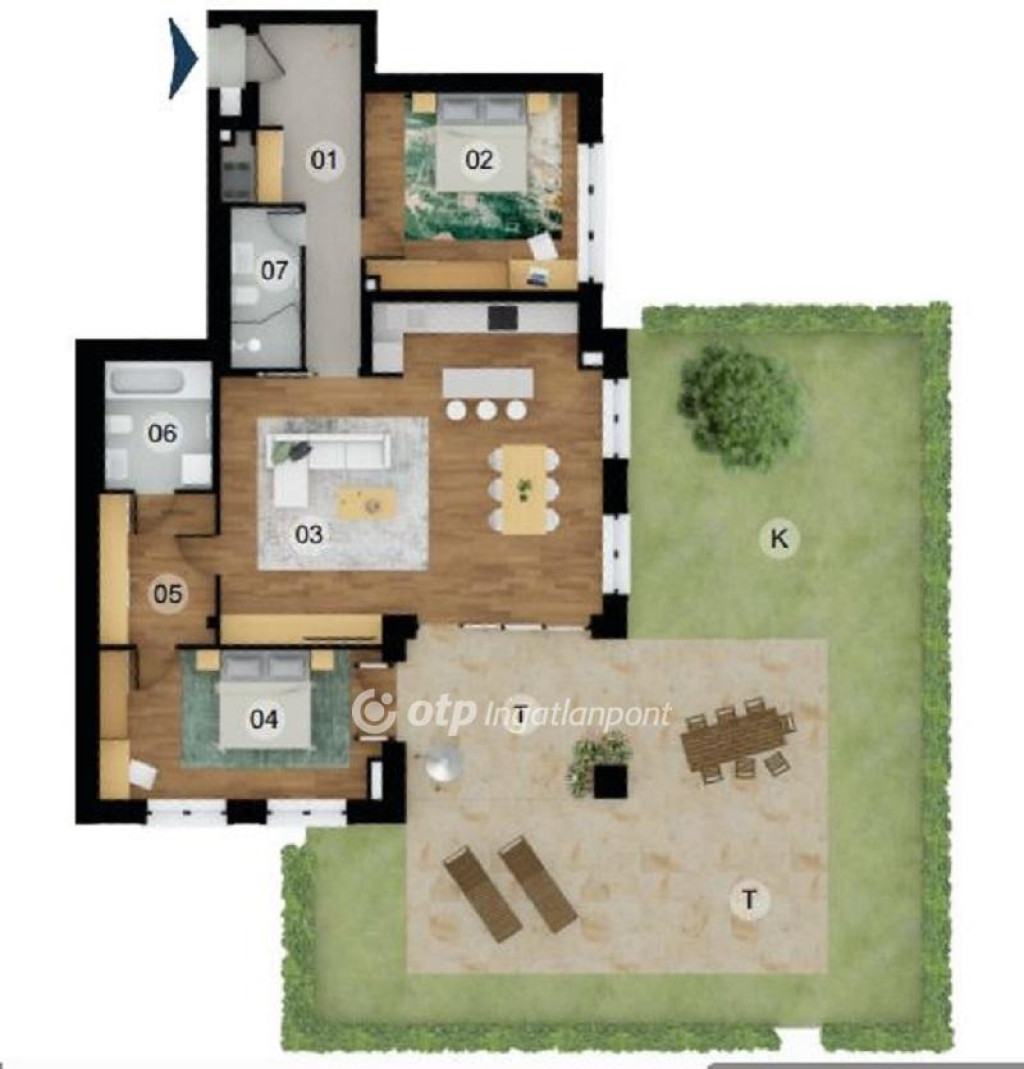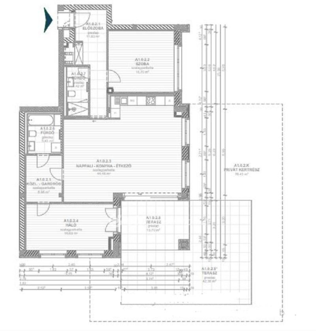 A hirdetésben szereplő lakás, az A épület földszintjén helyezkedik el, DK tájolással, 106.51 m2 alapterülettel, mely életteret tovább növeli a 56.06 m2 alapterületű terasz és a 70.43 m2 területű privát kert. A lakás helyiségei: Előszoba, Szoba, Amerikai konyhás nappali, Szoba, Fürdőszoba, Fürdőszoba, Közlekedő-Gardrób.