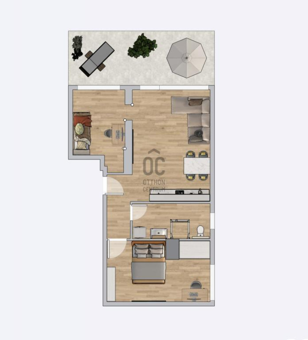 Elosztás: amerikai konyhás nappali, 2 hálószoba, 16m2 terasz, előszoba, fürdőszoba.