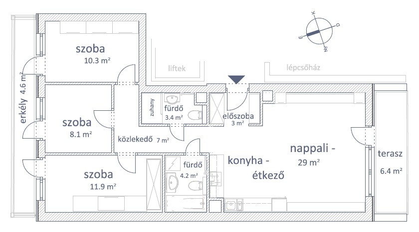 - önállóan nyíló 3 hálószoba, mindegyik közös erkélyre (kb. 4,6nm) nyílóan, teljes panorámával,
