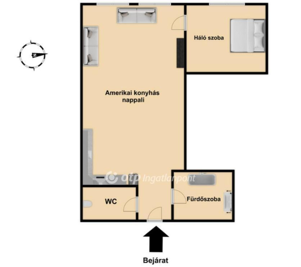 - Elrendezés: előszoba, amerikai konyhás nappali, hálószoba, fürdőszoba, WC külön helyiségben
