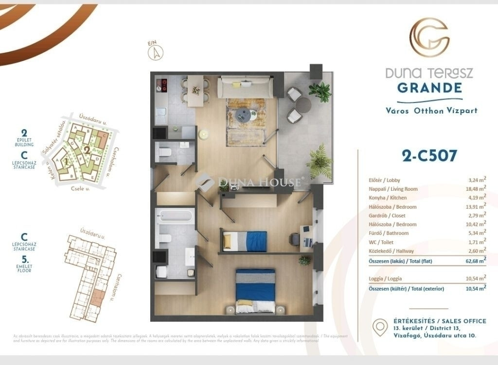 Eladó egy igazán stílusos, 63 m²-es, nappali + 2 hálós lakás, amit a 2024-ben átadott Duna Terasz Grande 5. emeletén találsz. A lakáshoz tartozik egy 11 m²-es terasz, ahol reggel a kávédat kortyolhatod, este pedig lazíthatsz a városi fényekben. A keleti fekvésnek köszönhetően mindig kellemesen világos, mégsem forrósodik túl nyáron.