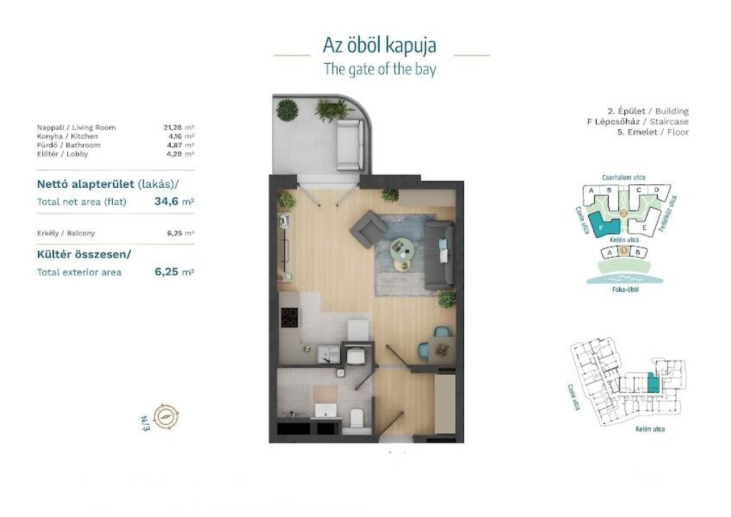 Eladásra kínálok egy 34,6 m²-es, ötödik emeleti, belső udvarra néző, egylégterű lakást, amelyhez egy 6,25 m²-es erkély tartozik. Az ingatlan a Duna Öböl közvetlen közelében épülő, modern és magas műszaki tartalommal megvalósuló lakópark részeként kerül átadásra.