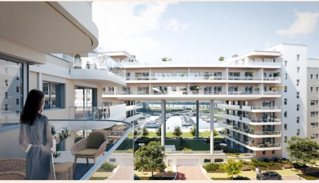 A 34.6 m² studio apartment is offered for sale on the 5th floor, facing the inner courtyard, featuring a 6.25 m² private balcony. The property is part of a premium residential development located just a short distance from the Danube Bay area.