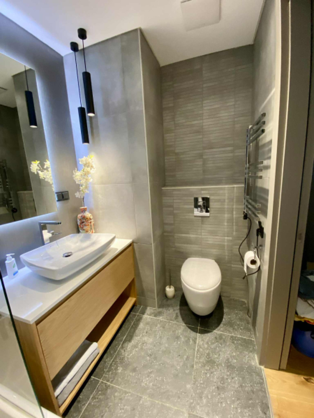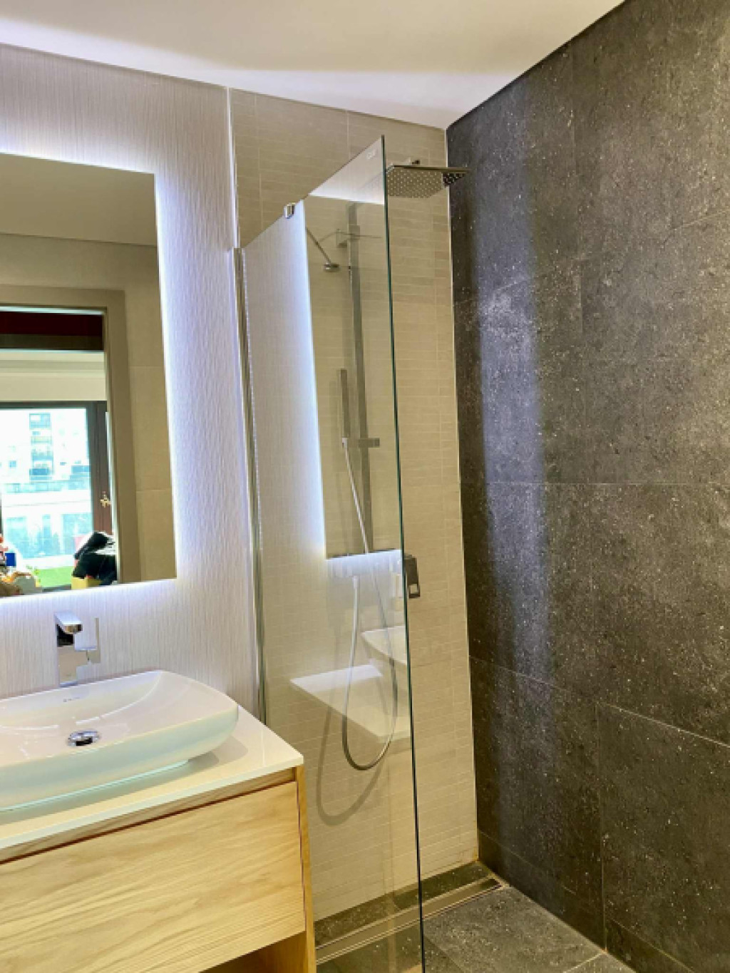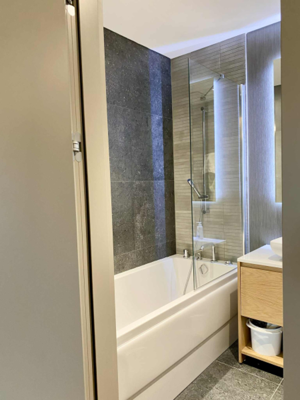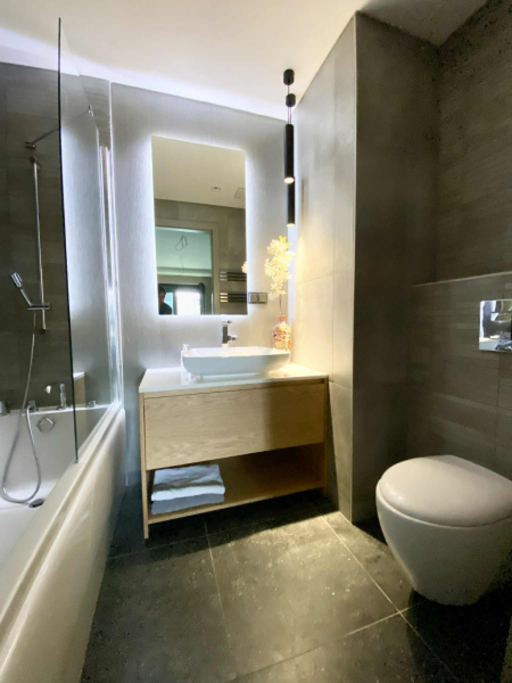A lakás dupla fürdőszobás, wc-kel, az egyik fürdőben káddal-, a másikban zuhanyzóval, lehet választani.