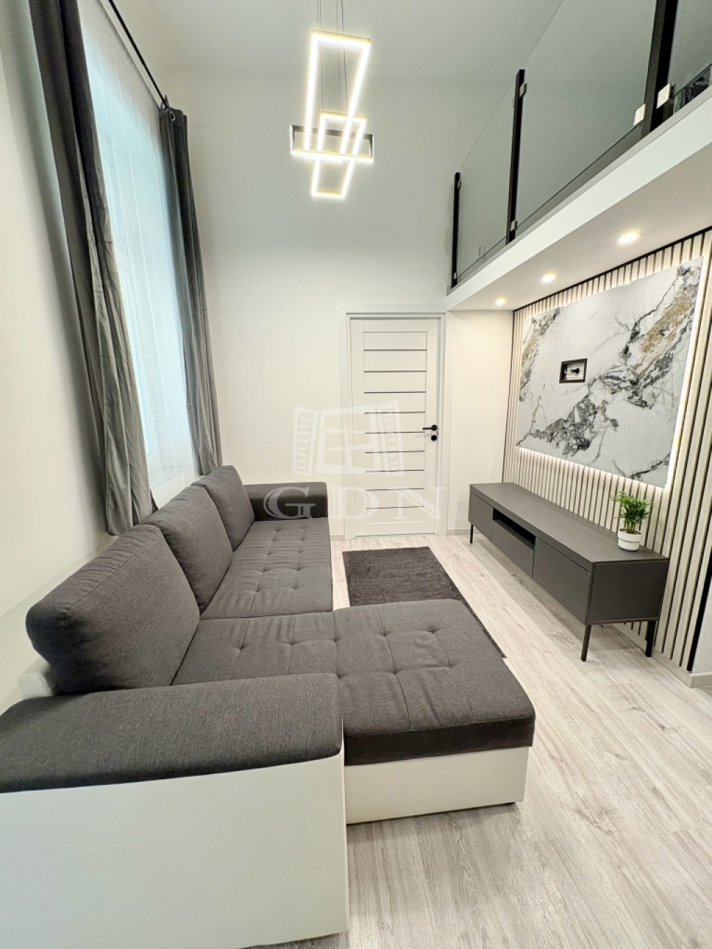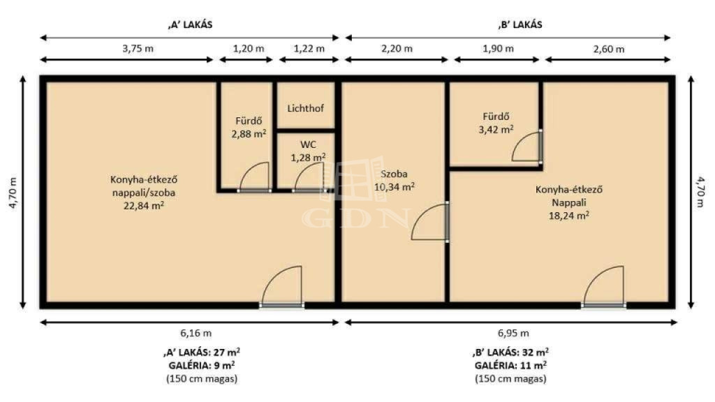 • „A” lakás: 27 m² + 9 m² galéria, elkészült konyhabútorral, gépészetkész állapotban.