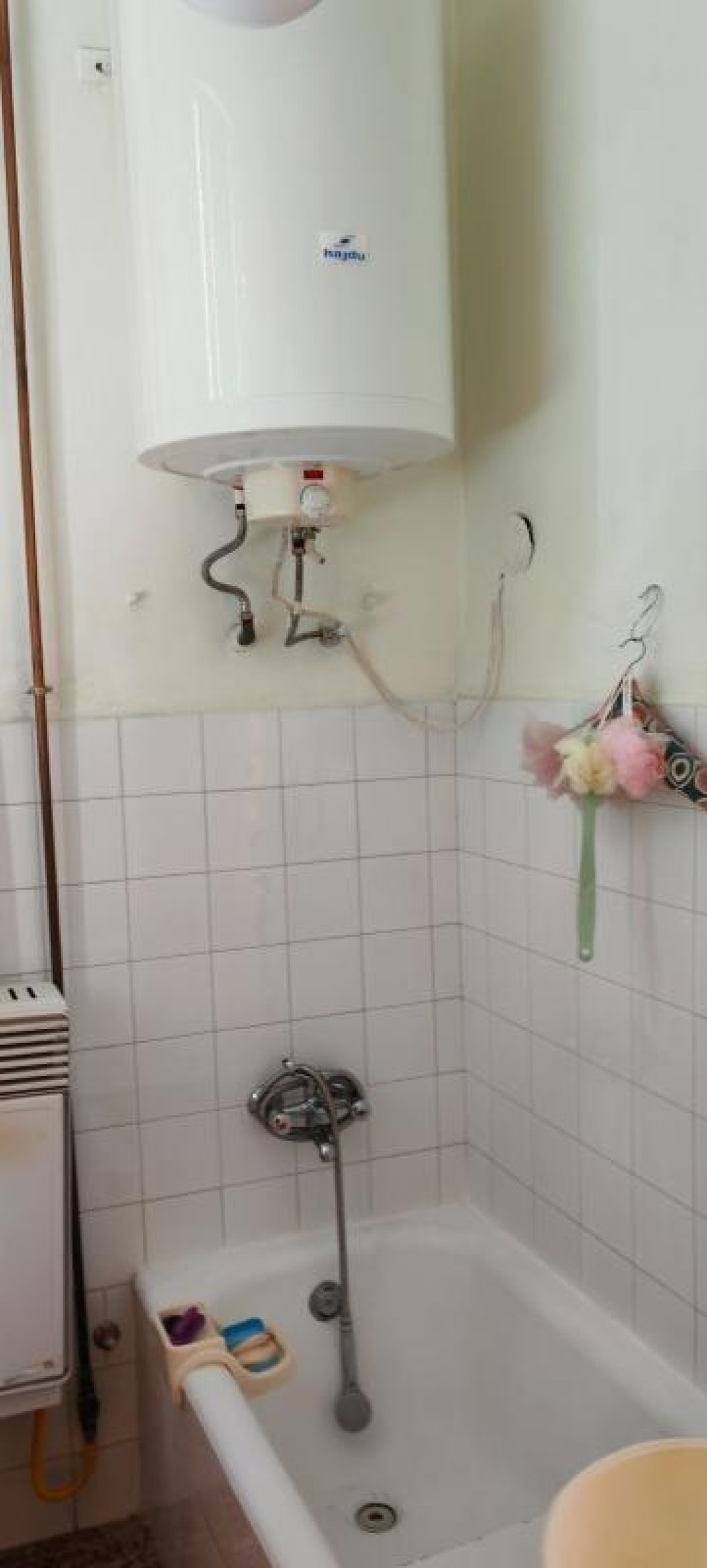 A konyhából közvetlenül bejárás nyílik a fürdőszobába, és szintén külön található a WC. A fürdőszobában elektromos bojler felelős a melegvíz előállításáért.