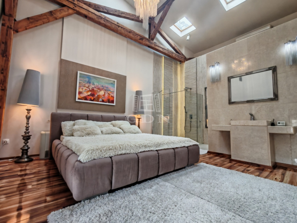 Ebből a különleges hangulatú hálószobából belső személyi lift visz fel az infraszaunához. Innen néhány lépcsővel elérhető a fából kialakított tetőterasz csodás panorámával. Tűzijáték páratlan élményt nyújt innen!