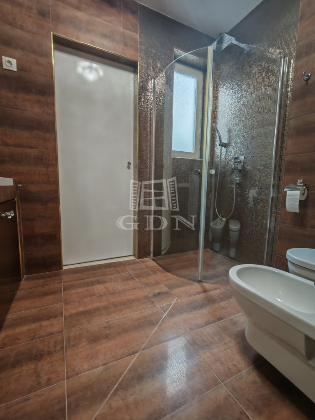 Gardróbhelyiségből nyíló fürdőszoba, amely zuhanyzóval, WC-vel és bidével felszerelt.