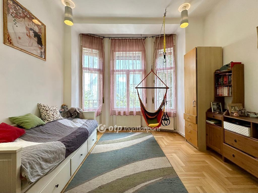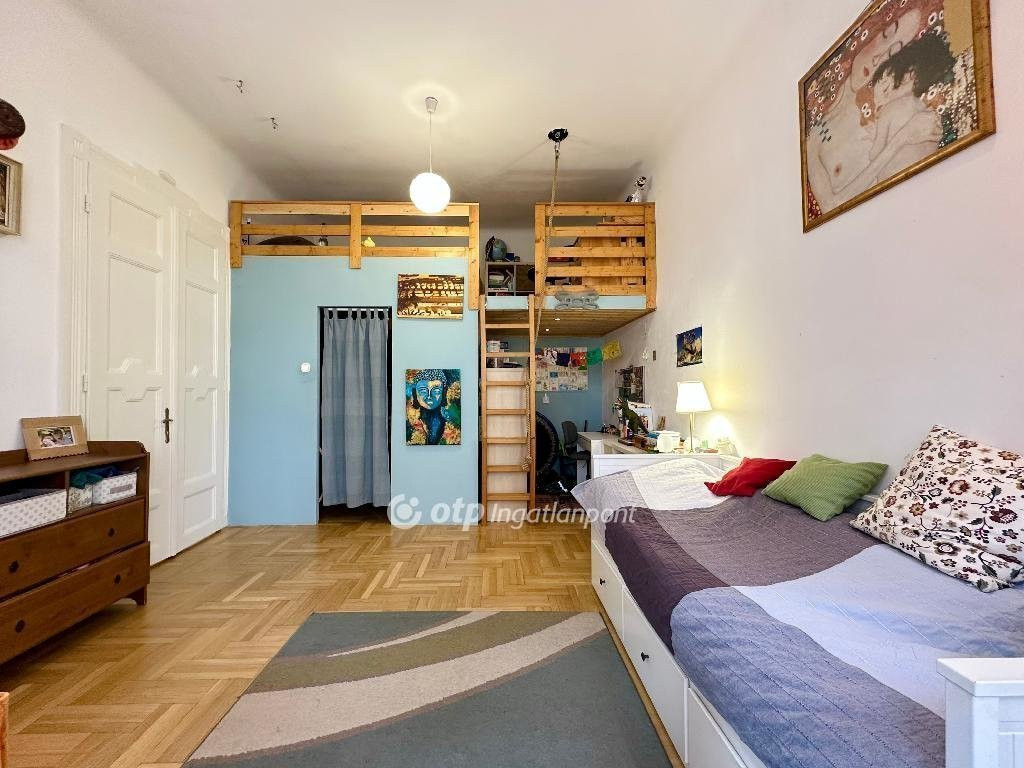 A tágas, első emeleti, liftes házban található lakás elrendezése praktikus: két nagy méretű, világos szoba (21 és 24 m2), valamint egy cselédszobából kialakított tároló vagy dolgozószoba is rendelkezésre áll. A belmagasság lehetővé tette egy egyedi kivitelezésű, 8 m2-es fekvőgaléria kiépítését is, amely jelenleg gyerekszobaként funkcionál, alatta kényelmes gardrób és dolgozórész kapott helyet.