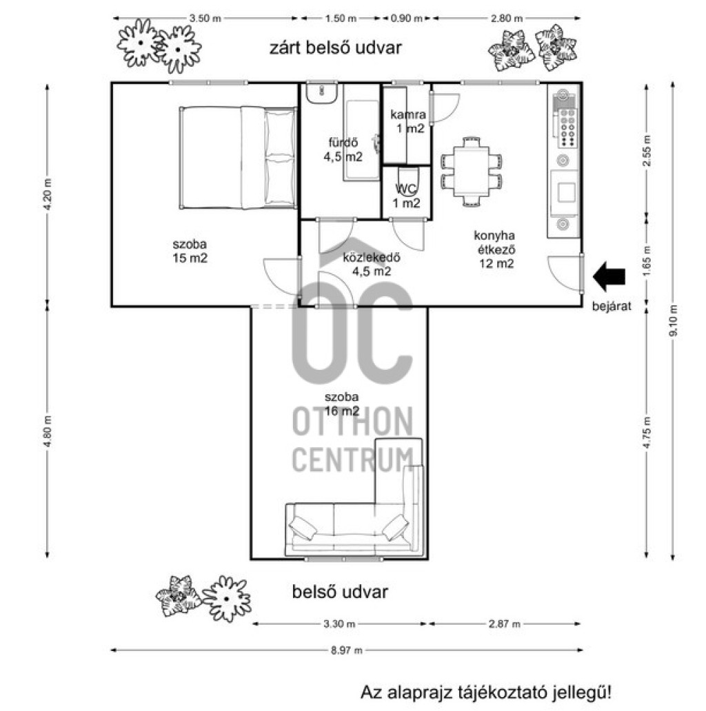 Az ingatlan jól alakítható terekkel rendelkezik: két ideális méretű szoba, világos étkezős konyha, külön fürdőszoba és WC szolgálja a kényelmet. A tárolásról kamra, valamint a WC felett kialakított praktikus tároló gondoskodik.
