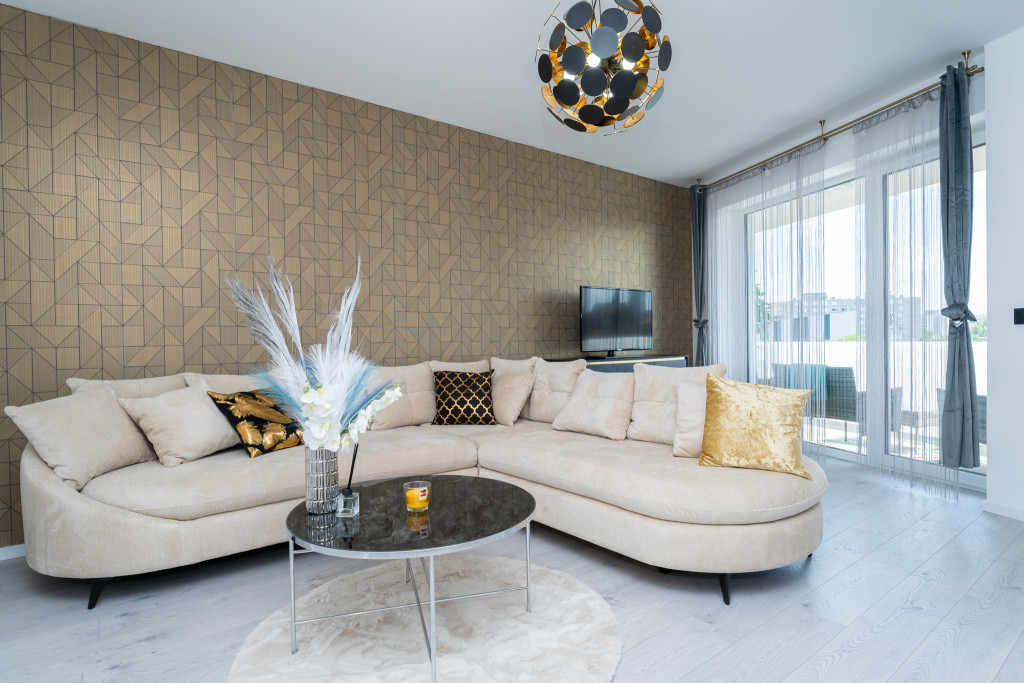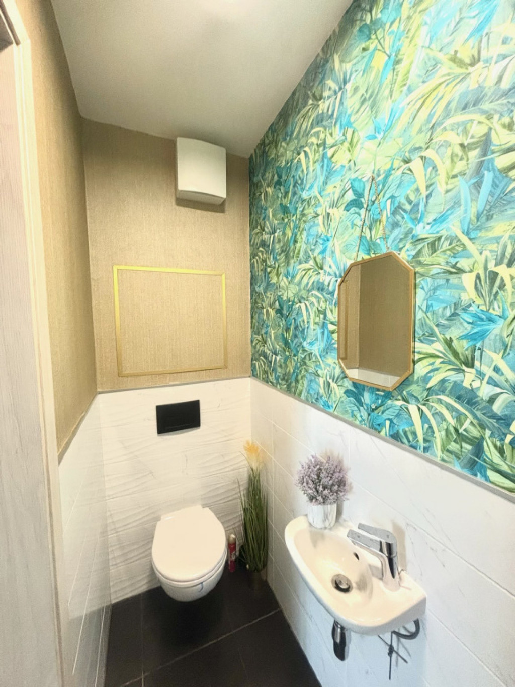 A lakás belsőépítész által tervezett, egyedi burkolatokkal, átgondolt gépészeti módosításokkal, AEG gépes konyhával, valamint mennyezeti hűtés-fűtésű, távolról irányítható okosotthon-rendszerrel rendelkezik.