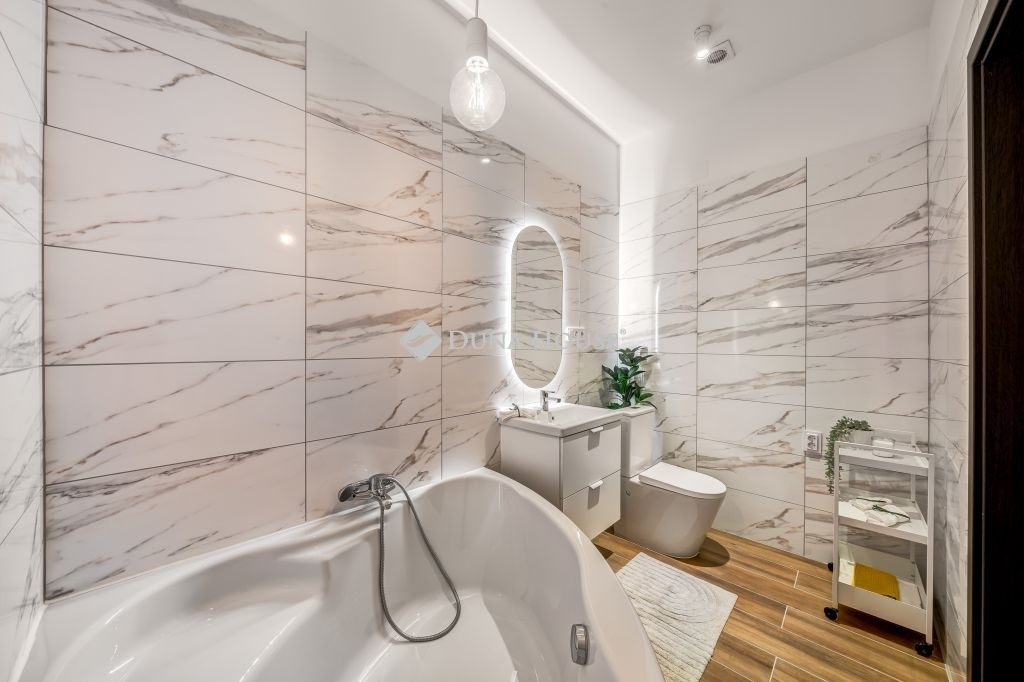 2 fürdőszoba + külön vendégtoalett, teljesen gépesített konyha, mosogatógéppel, délkeleti fekvés.
