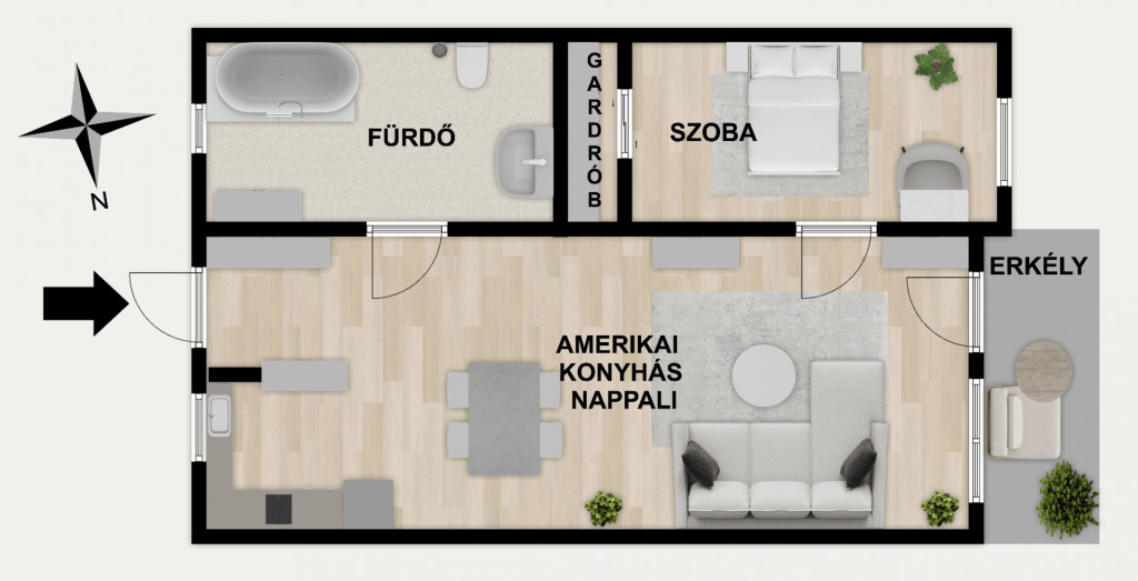 A 54 m2-es ingatlanban amerikai konyhás nappali erkéllyel (7 m2), 1 hálószoba, és fürdőszoba található.