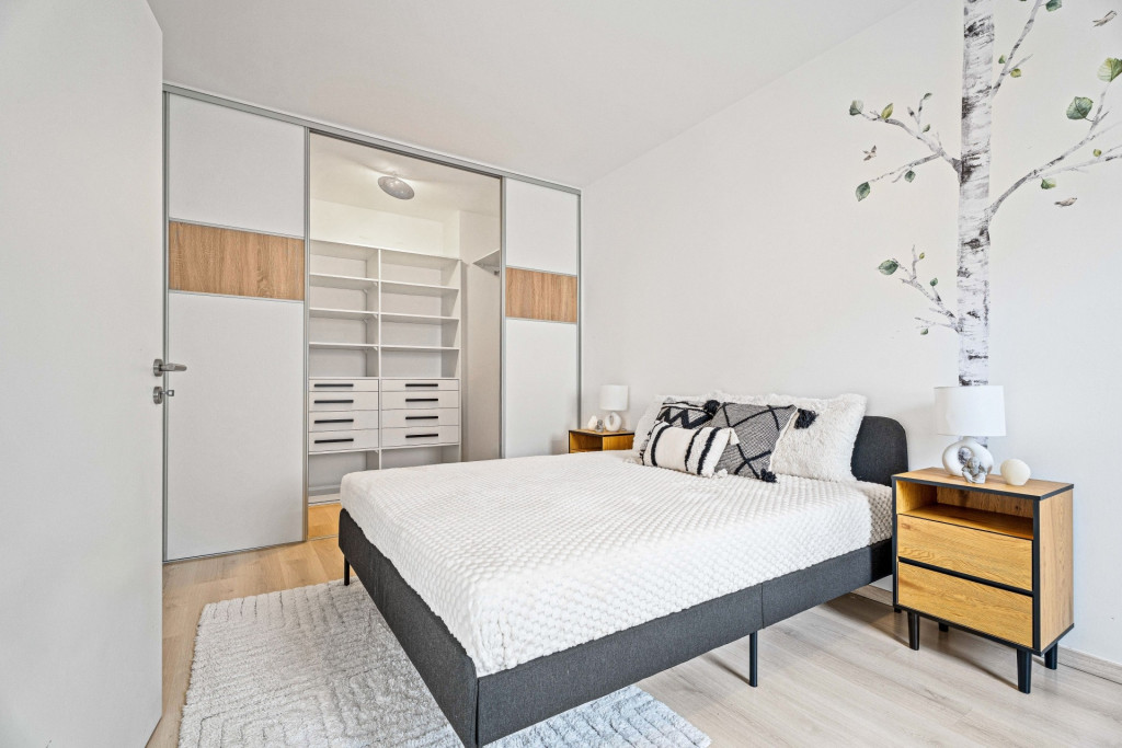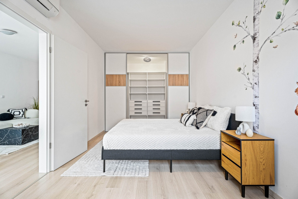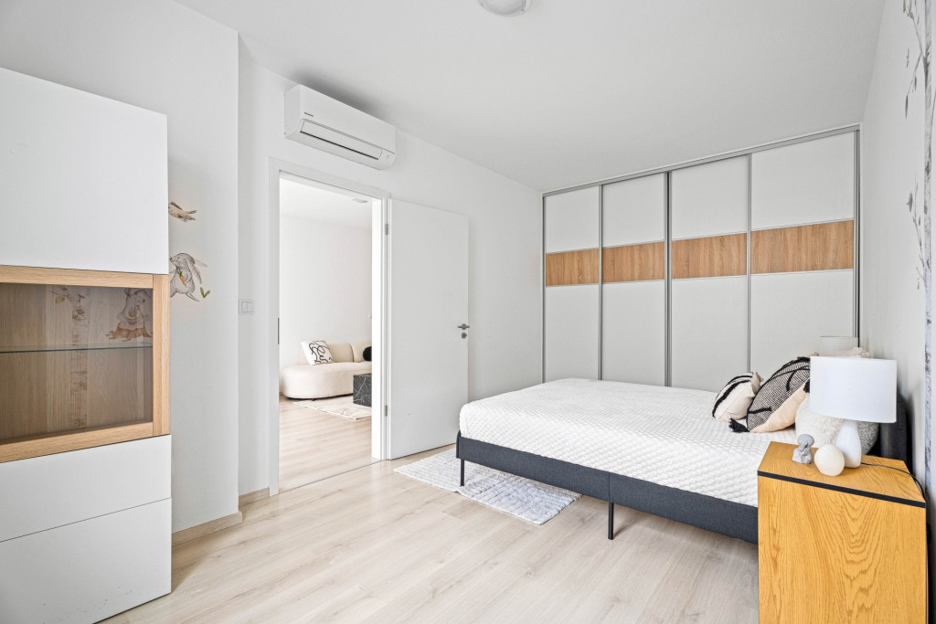 The apartment has high-quality built-in furniture and materials in every room. Its technical equipment is outstanding: air conditioning, electric shutters, 3-layer windows with mosquito nets and an alarm system.