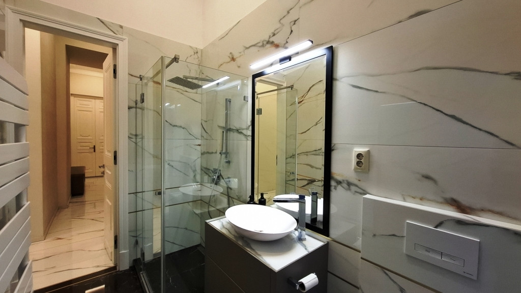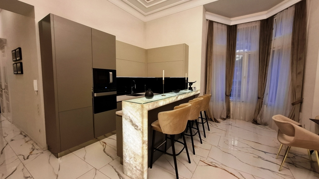 Belsőépítész munkáját dicséri az egyedi prémium kivitelű bútorok, minőségi burkolóanyagok és kortárs disignerek műveinek tökéletes ötvözése, mely egyszerre nyújt otthonos és kifinomúlt életérzést.