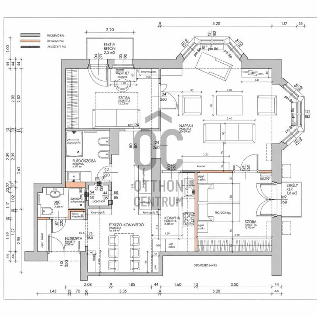 A biztonsági bejárati ajtón belépve az előszobában egy tükrös beépített szekrény fogad. Szemben a zuhanyzós fürdőszoba, jobbra az étkező található. itt mindenhol egyedi tervek alapján készült elegáns vonalvezetésű bútorok kerültek beépítésre. A közlekedőből nyílik még egy fürdőszoba , majd az impozáns nappaliba léphetünk, amely hatalmas ablakokkal, stílusos álmennyezettel és halszálkában rakott faparkettával fogad.